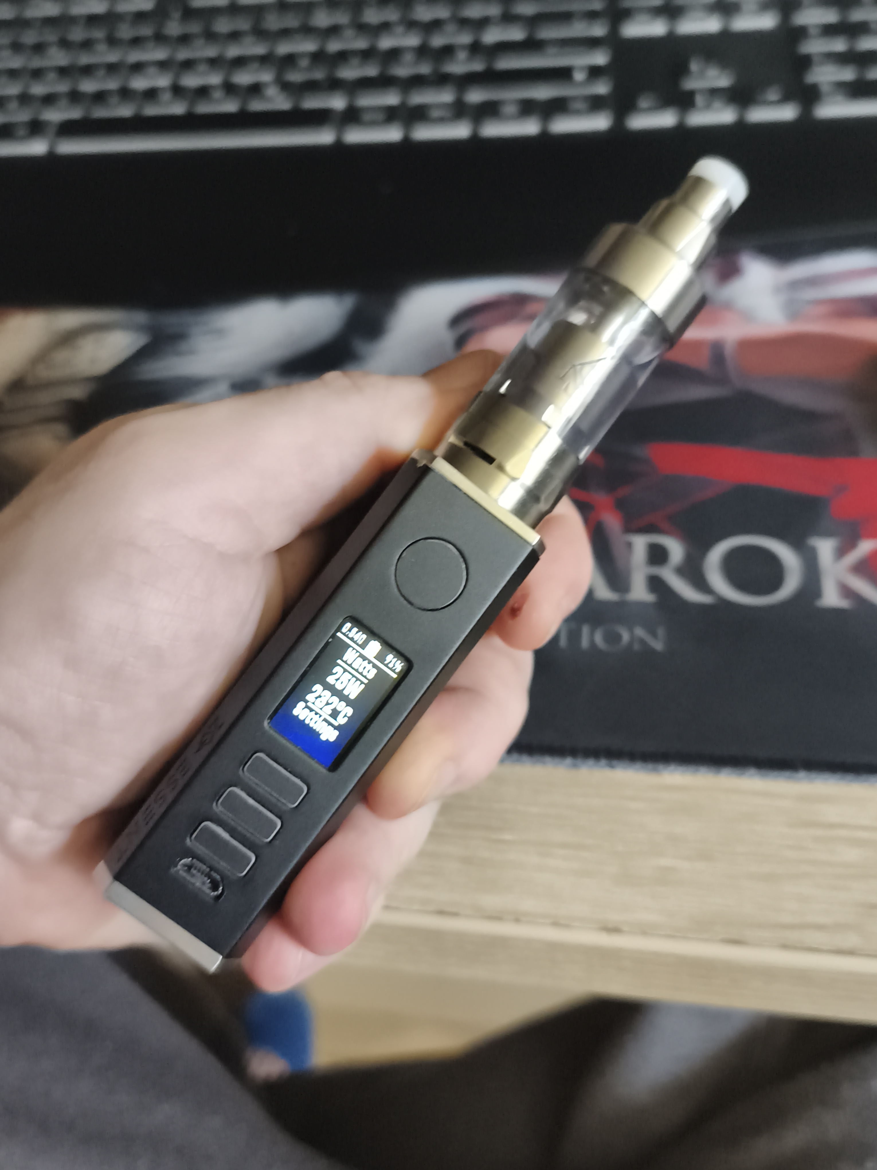 Original war dort eine Carbon Optik Folie verbaut. Diese habe ich aber gegen die Resin Optik Applikationen der Gunmetal getauscht, finde ich schöner. Das Board war ein neues DNA75C das jetzt ca. 1500 Puffs weg hat.