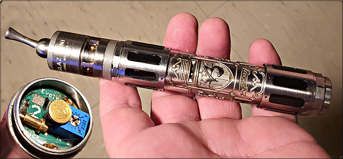... und hier ein Bild vom Flip-Tronix mit dem VD GAZ, wobei man problemlos auch noch diesen mechanischen AT mithilfe des Evolv Kick zu einem geregelten AT aufrüsten konnte: Das erste Model des EVOLV Kick hat eine Ausgabeleistung von 5-10 Watt (die V2 dann ein wenig mehr Wattleistung!), was an einem DC-DC Converter (blaues Kästchen) mit einem Kleinst-Schlitzschraubenzieher eingestellt werden konnte. Die Elektronik gab Power bis zum Schluss und hatte auch eine automatische Abschaltung, wenn der Akku aufgeladen werden musste! - und trotzdem passte in diese Flip-Hülse immer noch ein 18650er Akkus rein - einfach genial durchdacht!
