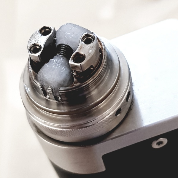 Im single Modus recht einfach zu bauen, Nachfluss auch ohne hohen squonk-pin problemlos, airflow sehr leise, leicht restriktiver DL-Zug, airflow-Ring ist austauschbar für dual-Wicklungen, top cap wird nur mäßig warm, idealer Zug nur mit dem original dt.