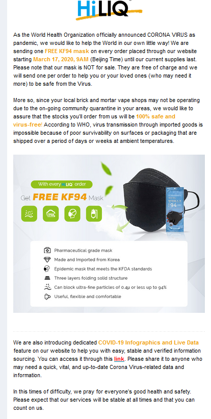 Aufgrund der Auswirkungen im chinesischen Raum, durch den bekannten Virus, kommt es zu Problem mit dem Nachschub von bei uns ausverkauften Artikeln. Diese Situation betrifft die E-Zigaretten-Branche weltweit. Viele Hersteller können "vorraussichtlich" ab April wieder liefern, weswegen wir bei vielen Artikeln das Erscheinungsdatum angepasst haben. Aufgrund der Warenknappheit kann es vorkommen, das wir einen oder mehrere Artkel einer gesetzten Bestellung stornieren müssen, wenn dieser nicht mehr lieferbar ist. Dies betrifft nun auch Liquids, da die Liquidhersteller keine leeren Flaschen von den Fabriken mehr erhalten, um weiter produzieren zu können. Wir bitten um Verständnis.