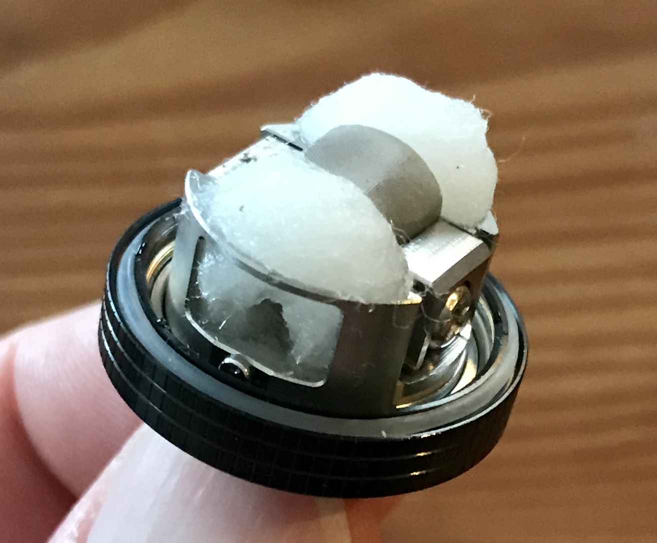 Hab unten in der Watte einen Durchgang gelassen, damit das Liquid auch in die Mitte unter die Watte laufen kann.