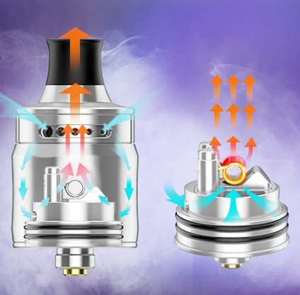 Durch diese sehr lange Luftführung, der 3D-Airflow unten am Deck und der individuellen Einstellung der obigen Luftlöcher kann jeder auch offen dampfen mit leichtem Zugwiderstand. Das ist aber kein Vergleich zu den echten Dampfgeräten mit total offener Luftführung. Man kann aber auch bis zum kleinsten Loch die Luftführung sehr stramm einstellen. Dabei wird der Dampf dann schon etwas wärmer und der Flash stärker. Nicht jeder mag das, aber wer darauf steht, kann dies hier verwirklichen, ohne Verlust von Geschmack und Flash, der immer da ist, auch wenn die Konsistenz sich je nach Öffnung des Luftstromes ändert. Somit kommt jeder auf seine Geschmacksrichtung, was die Qualität des Luftzuges oder den individuellen Geschmack und die Flashstärke betrifft.