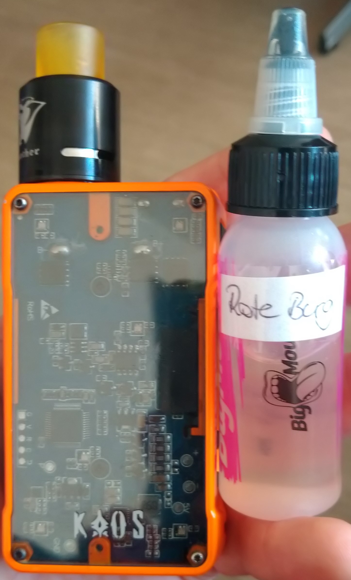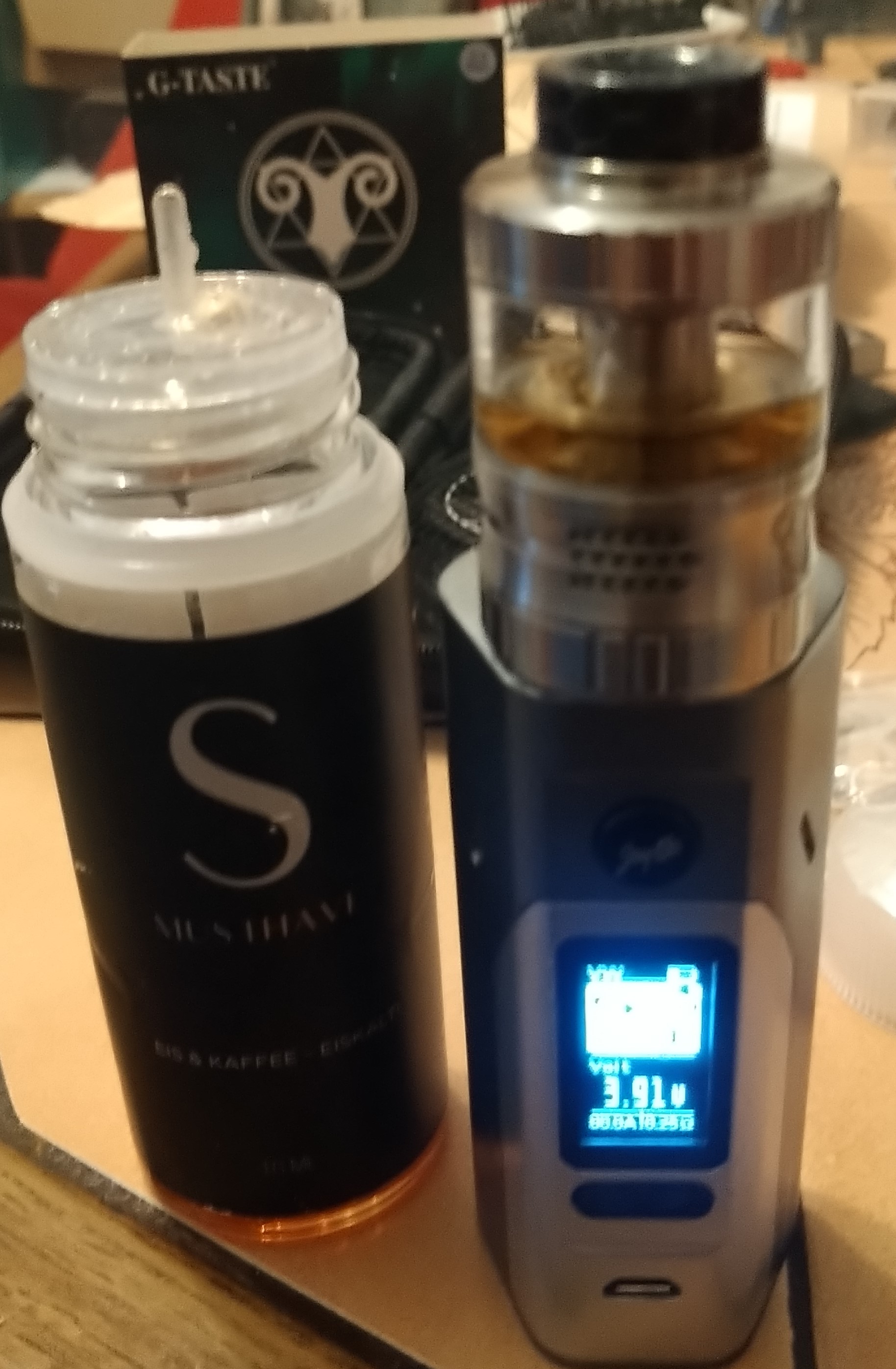 Inzwischen habe ich, wie in meinem Avatar zu sehen, eine Sigelei KOAS Z 200W Mod Box mit einem Zeus (1) RTA, in schwarz und ein 2. in Gunmetal, im Tagesgebrauch.
