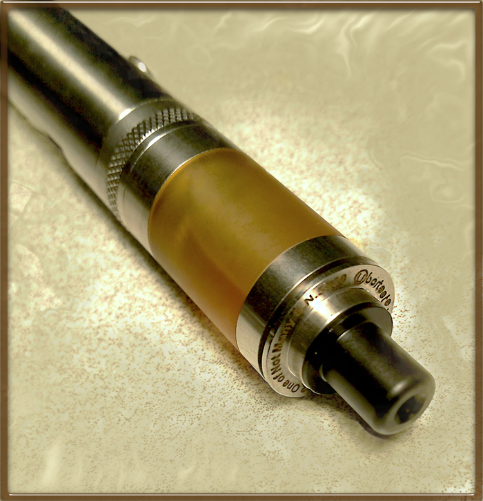 Ich empfehle durchaus die Verwendung des mitgelieferten Driptips aus schwarzem Plastik, der einen schön-engen Durchmesser hat und mit seiner ausreichenden Länge bei mir sehr angenehm im Mund liegt.. Da der Ultem-PEI-Tank mit Metall verschraubt wird, können die Gewinde u. U. (bei unsachgemäßem Gebrauch) ausleiern. Daher empfehle ich auch, den großen und kleineren 2,3ml-Tank gleich mitzubestellen, wenn sie gerade auch vorrätig sein sollten.