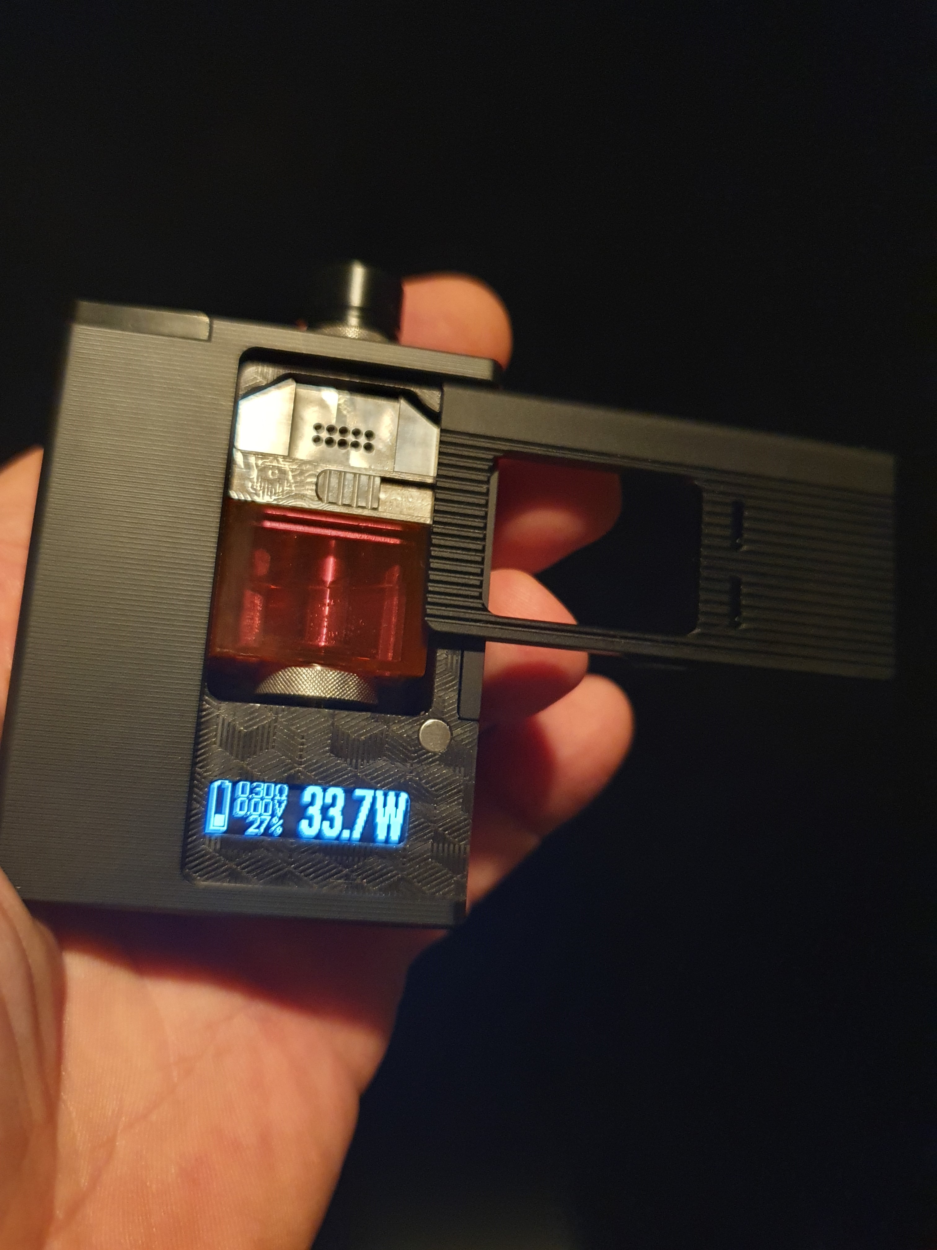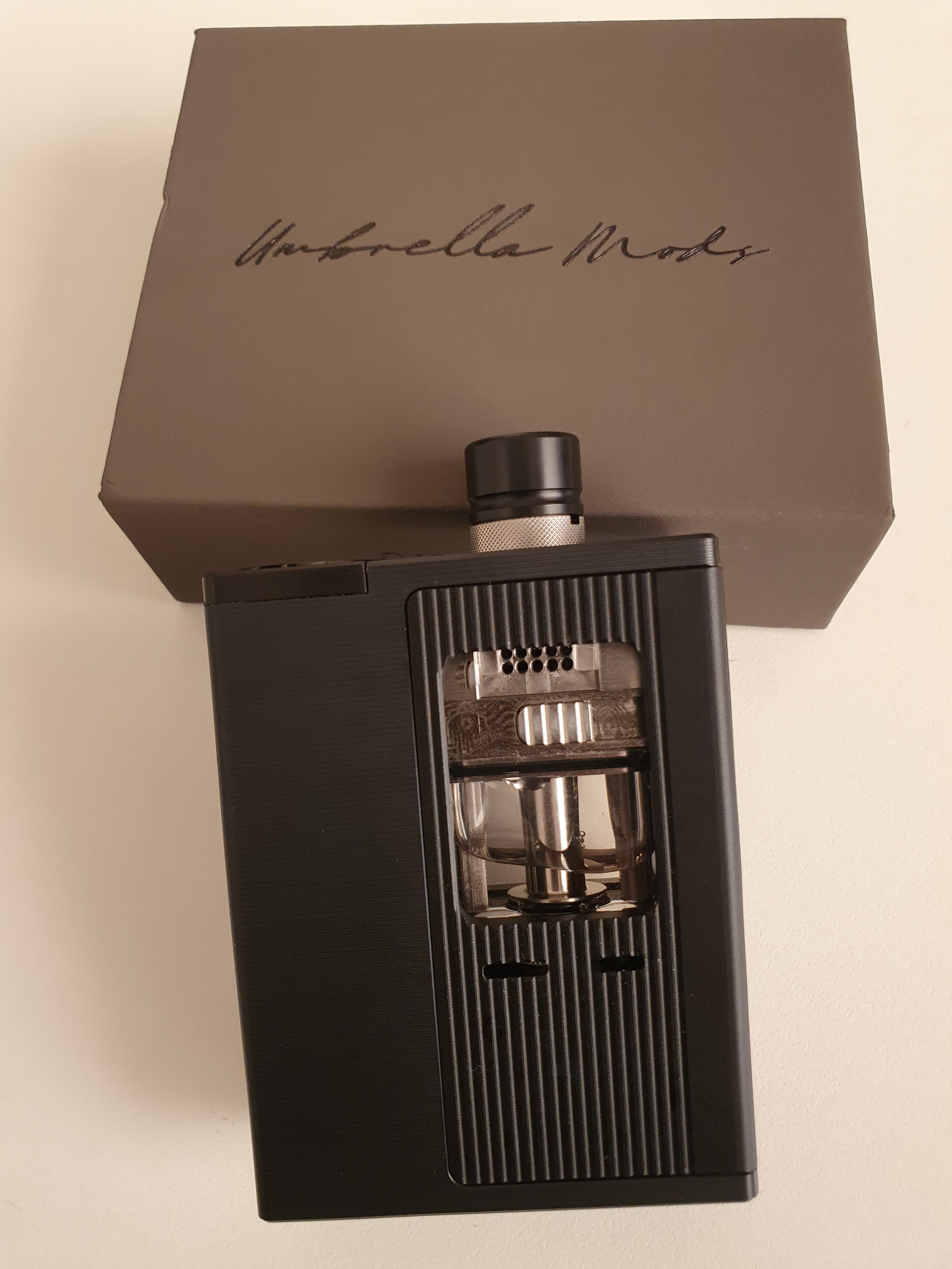 Gratulation: Das sieht ja recht gelungen aus, Deine neue Boro Box Passport AIO von Umbrella Mods mit der eingebauten Atemporal Boro RBA von The Mind Flayer X Damn Vape! Die Borobox erscheint mir ziemlich breiter als normal in Deiner Hand oder?
