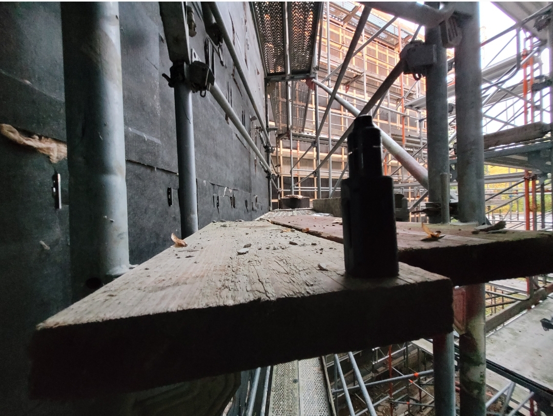 , so großes Baugerüst und nur ein Bauarbeiter, Dampfe von der Gummiboot