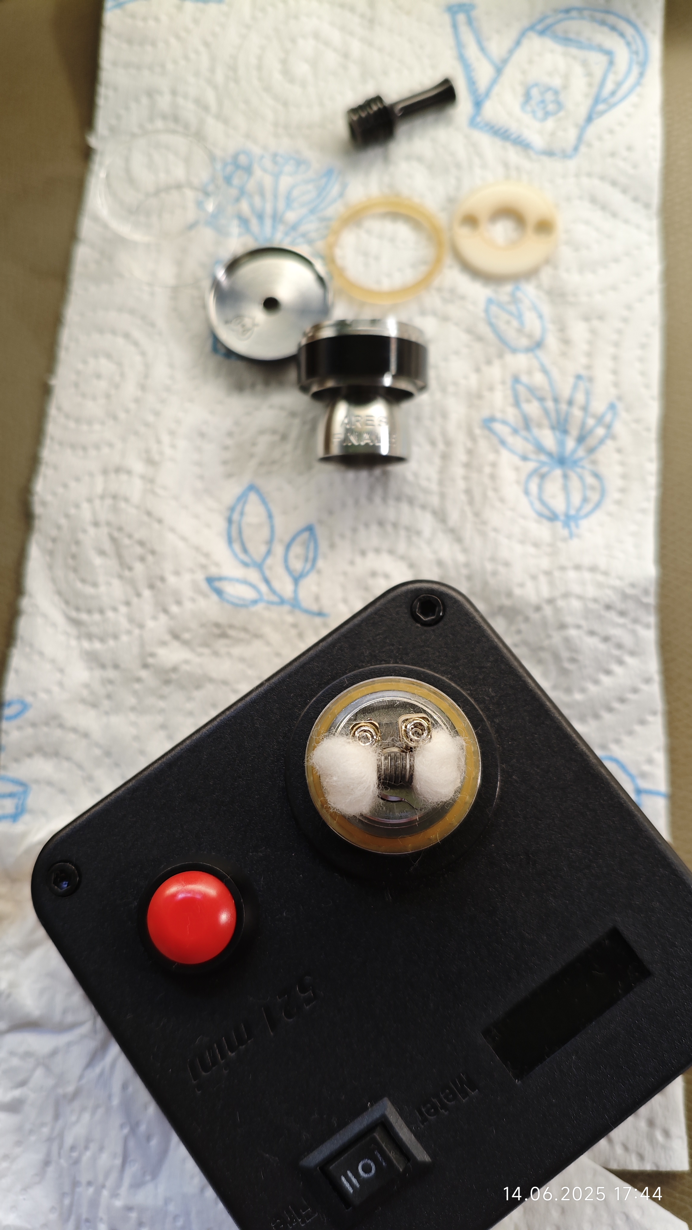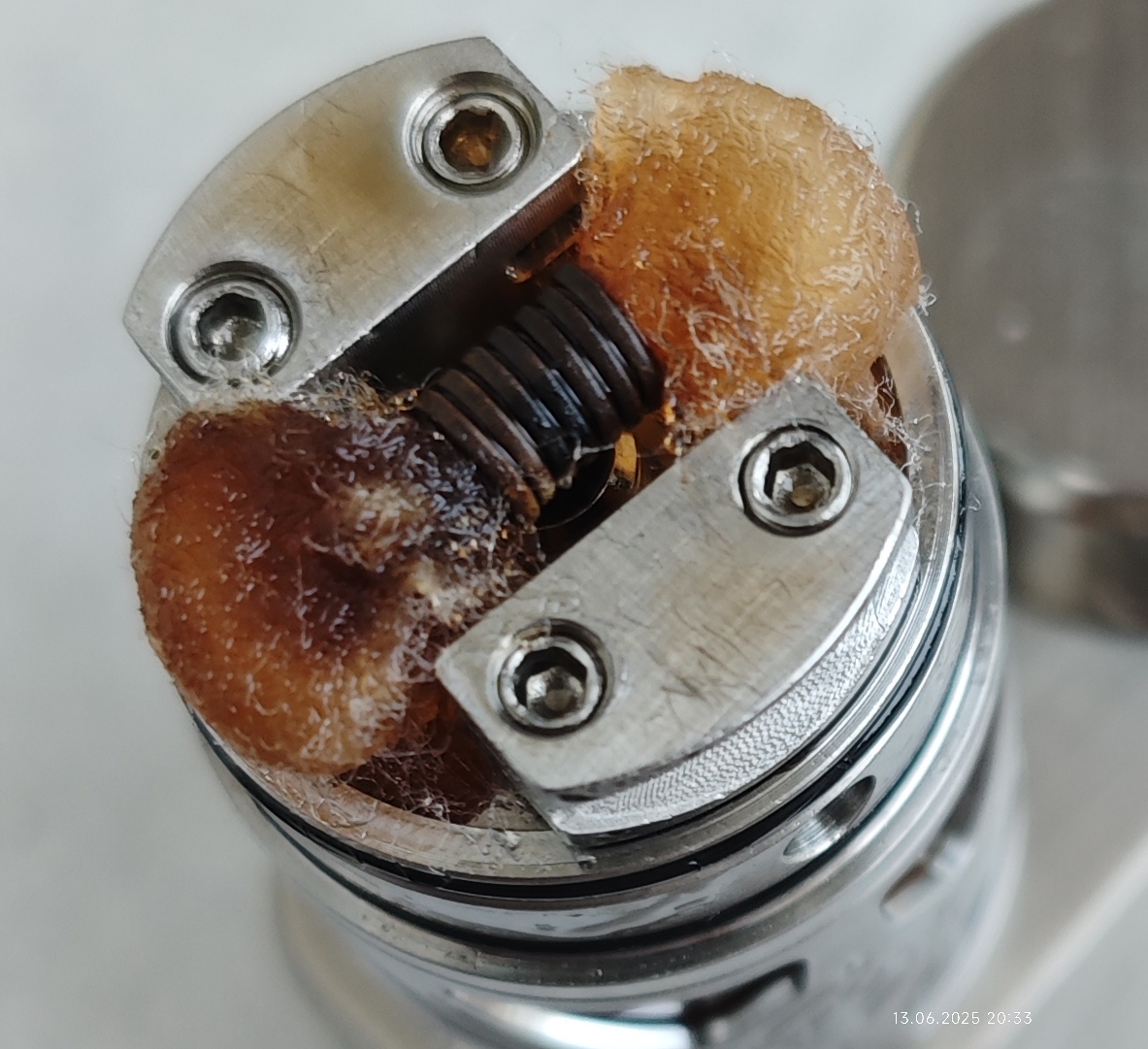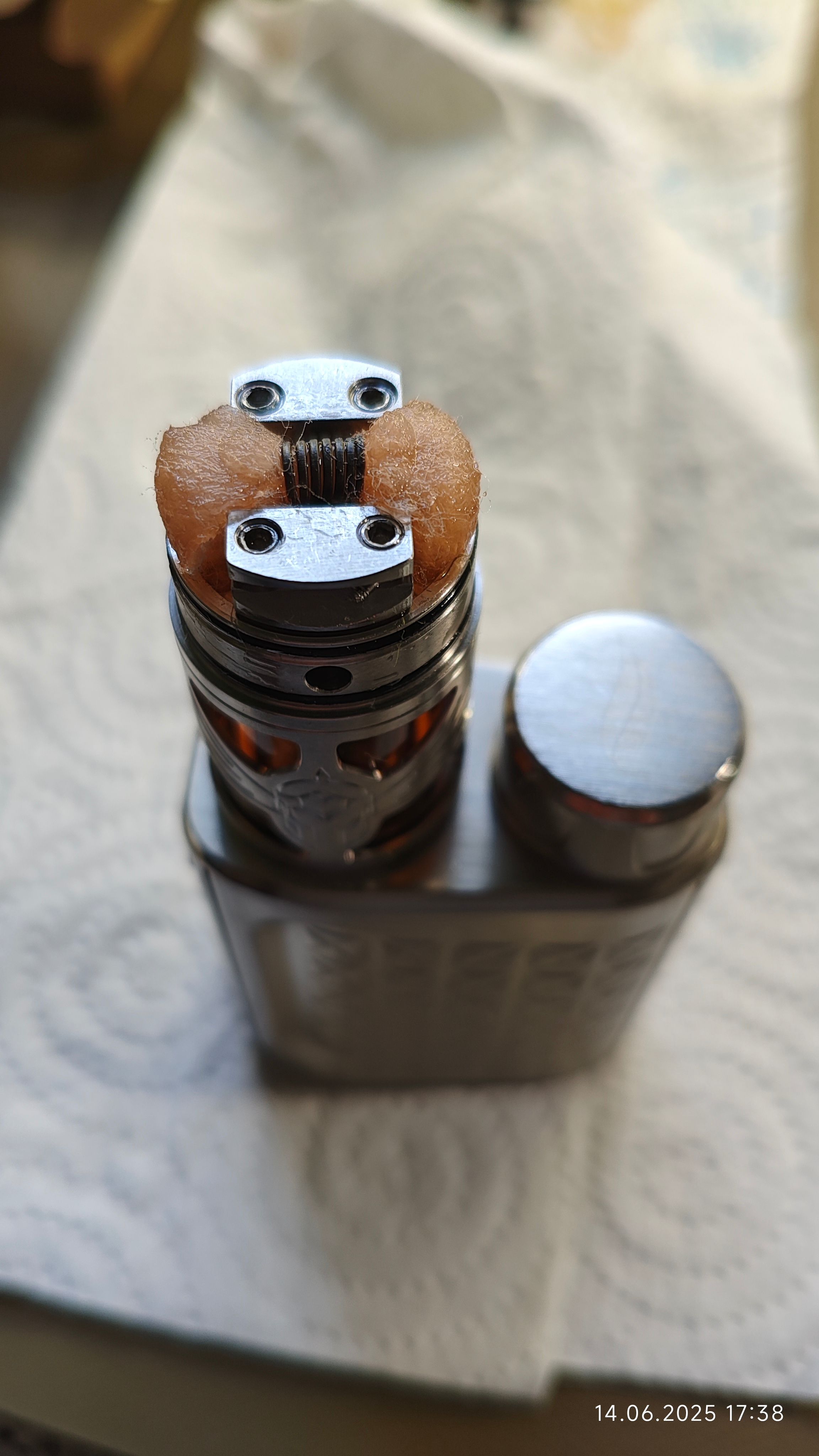 , 3 mm ID SS316L 28*2/30 GA, zu die Airflow Schraube ist so wenig Platz da müsste ich die Coil ordentlich nach oben ziehen, erste ist dabei kaputt gegangen, mit zweite hat gerade so geklappt (natürlich bei dem ganzen hin und her hab keine Bilder gemacht) Und so wenig Watte, da Brunhilde MTL hat viel mehr.Ich glaube er ist auch MTL auch geeignet, schließlich nicht um sonst dabei ist eine DripTip Reduktion und auch kleine Luftschrauben. Ich probiere im Morgen als MTL-er.