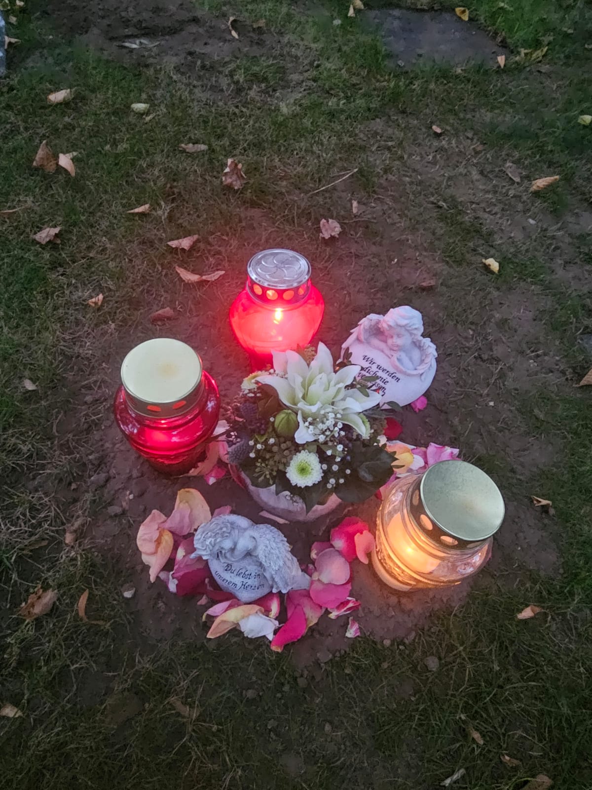 So haben wir es jetzt erstmal gestaltet bis der Grabstein kommt. Da muss ich morgen mal nachfragen