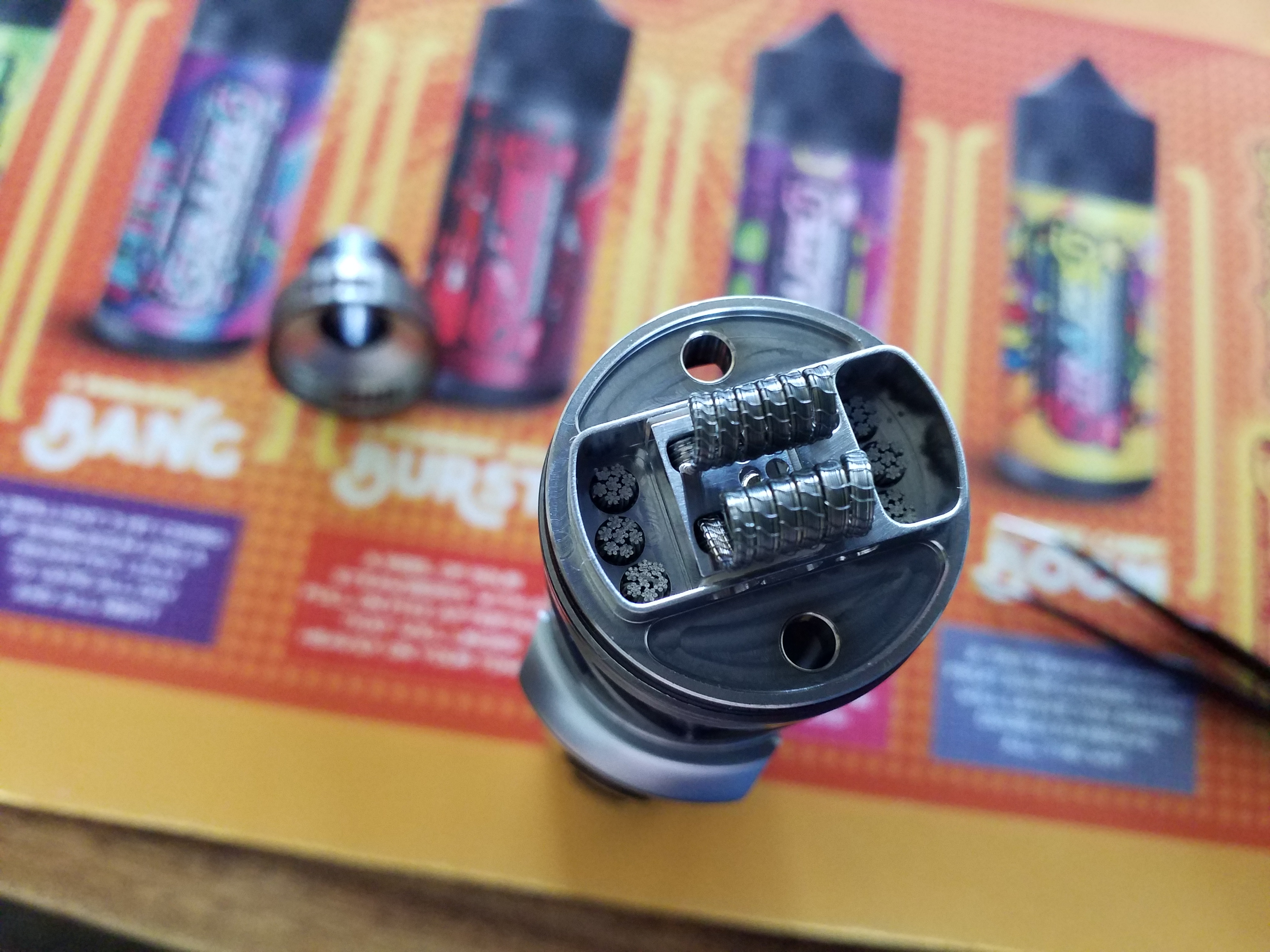 Aus einer Airflowöffnung wurden flugs mal 2, die aufgebohrten Öffnungen sind wahrlich für DL ausgelegt. Die braided Coil ist klasse (merci Nifiz ) und geschmacklich kommt mein Grapefruit-Zitronenjoghurt schon sehr gut rüber.