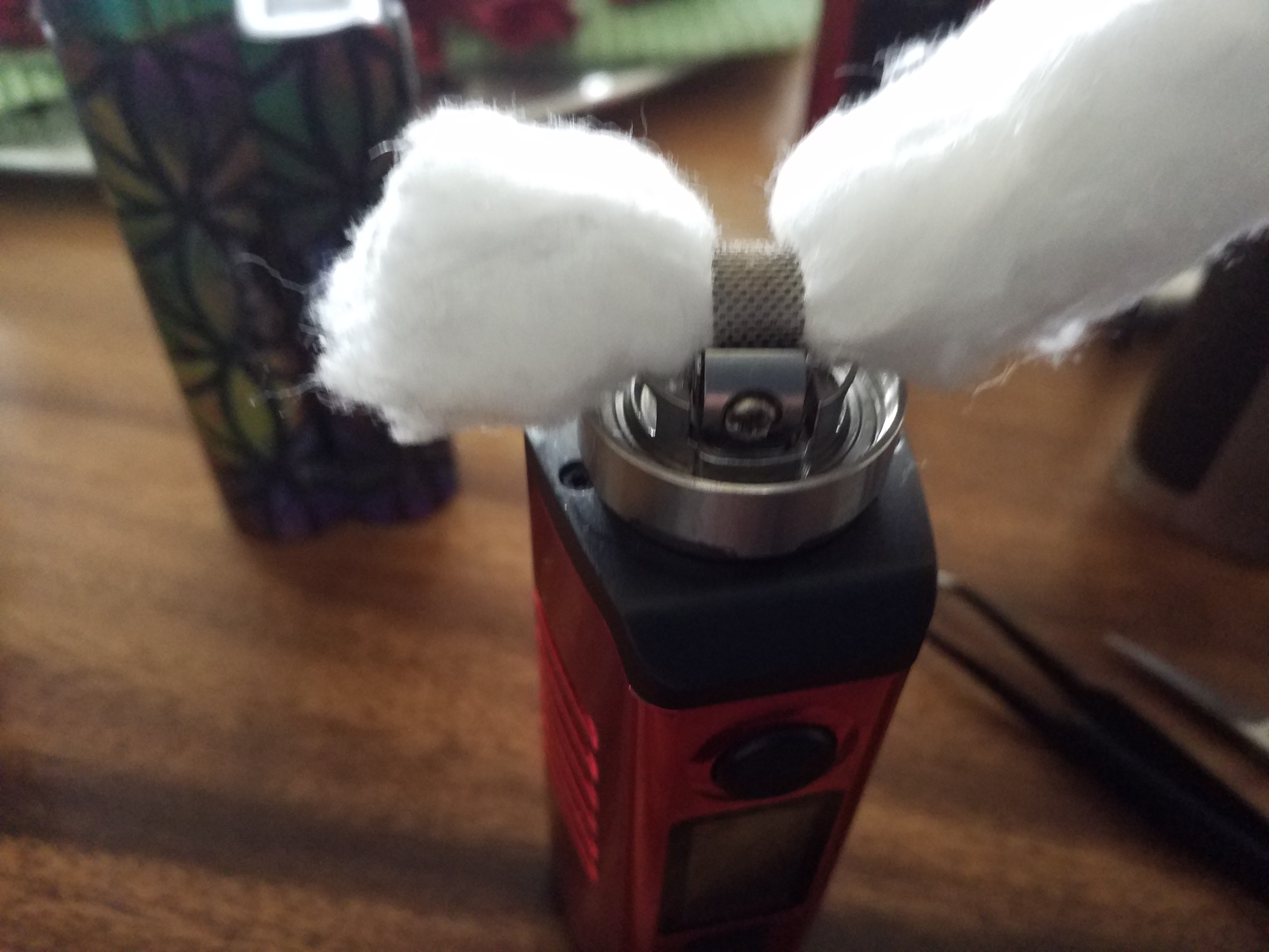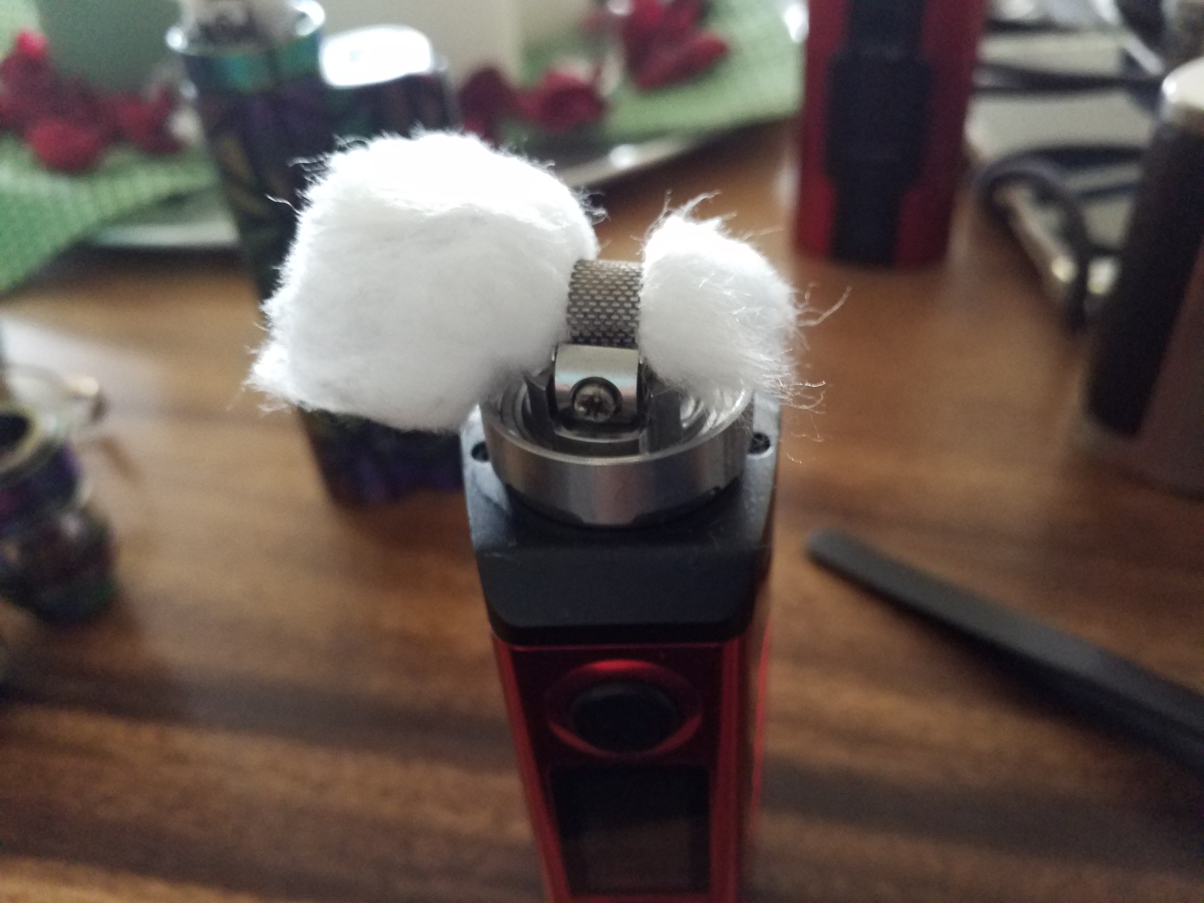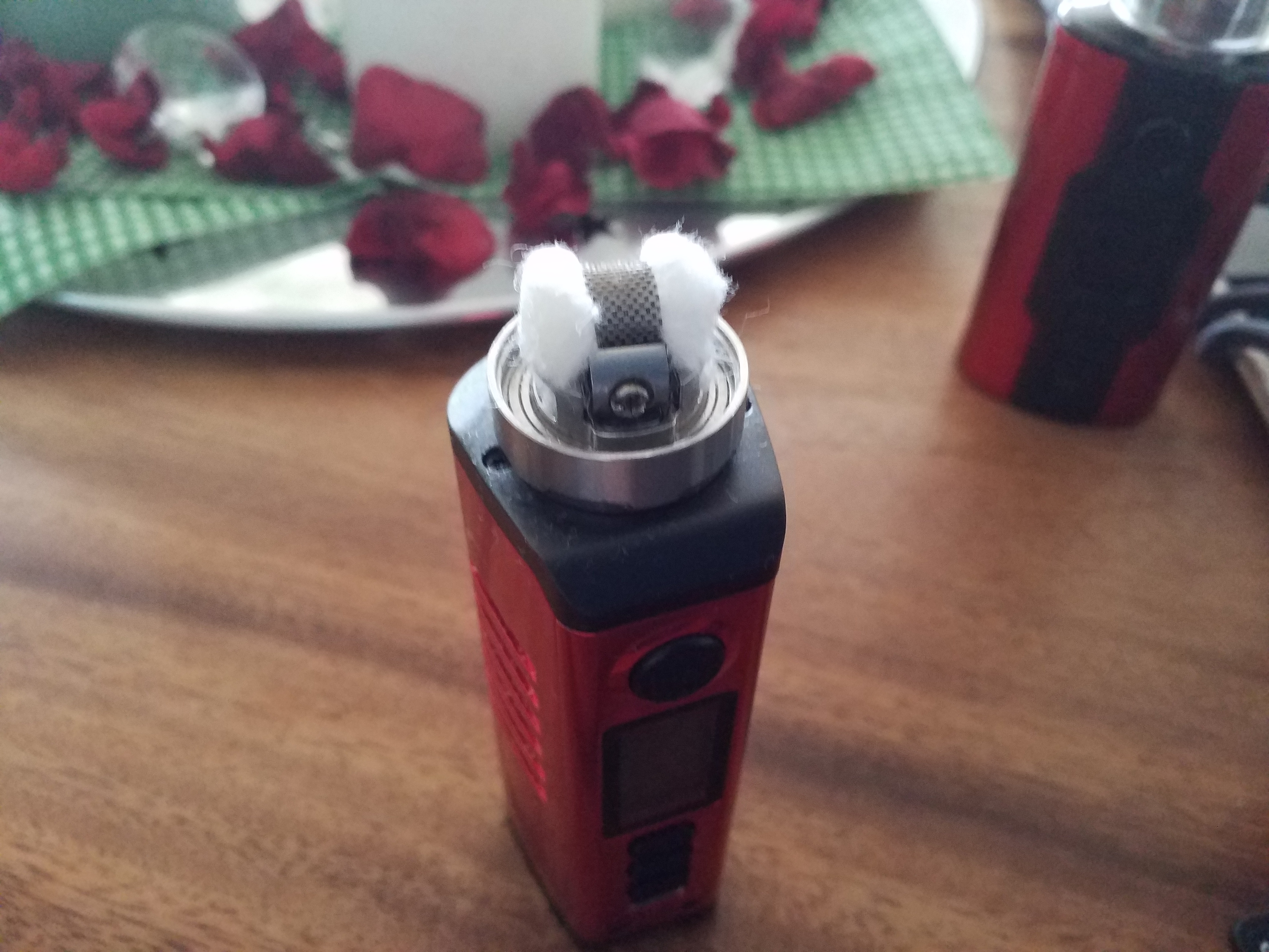 Die verbliebene Watte wird dann in die Liquidtaschen geschoben, Watte gut mit Liquid tränken und fertig gewickelt steht der Meshverdampfer vor mir.