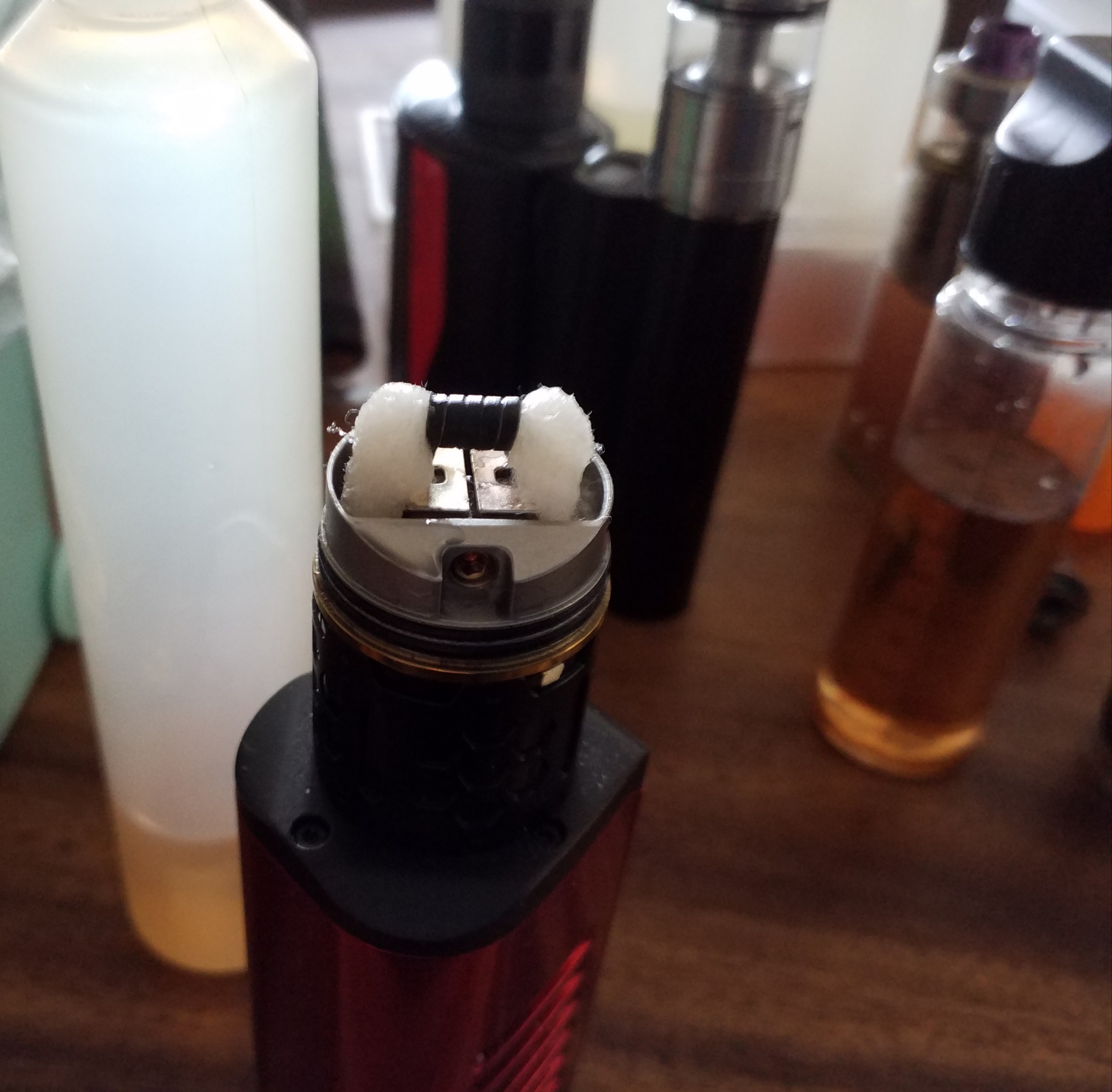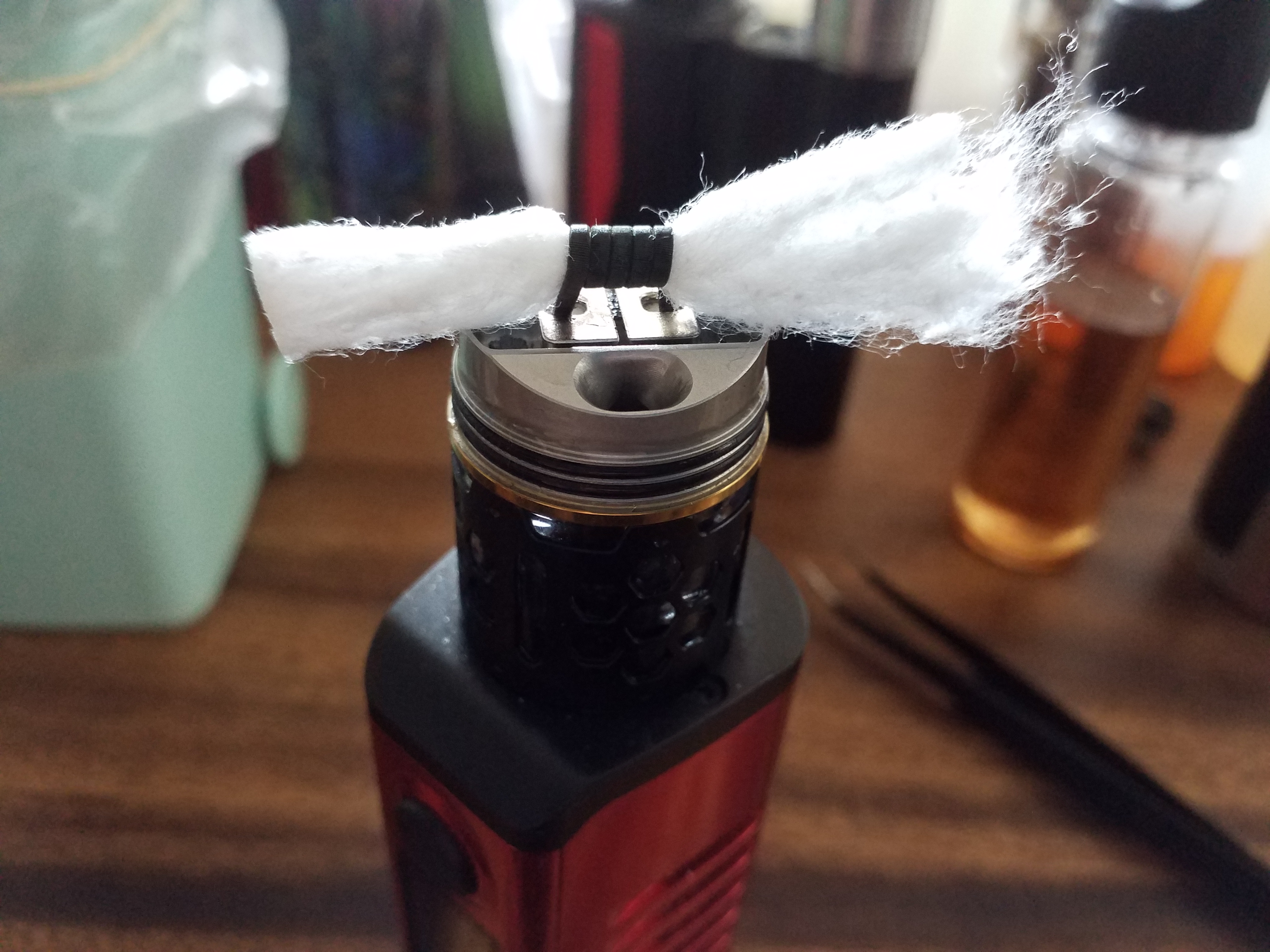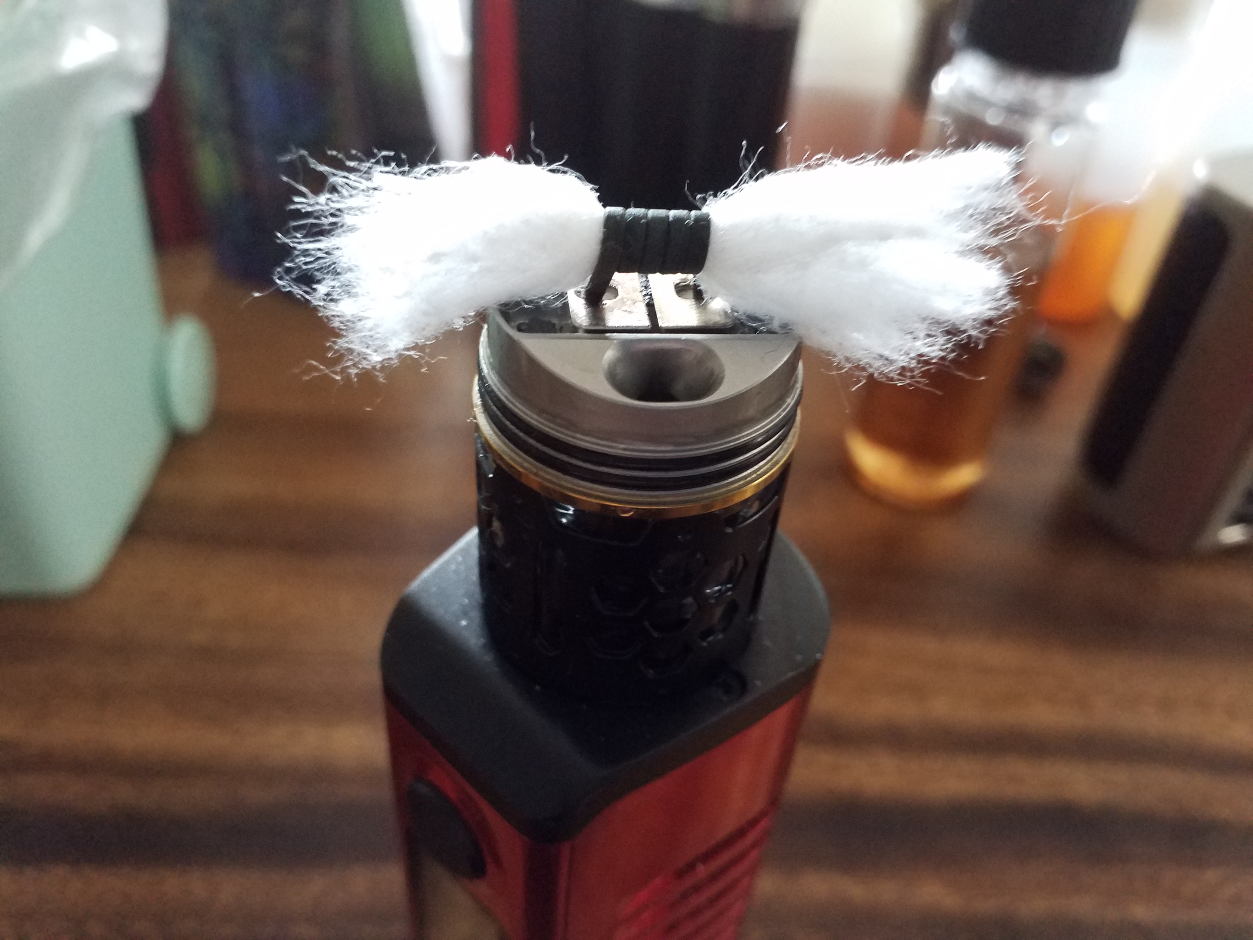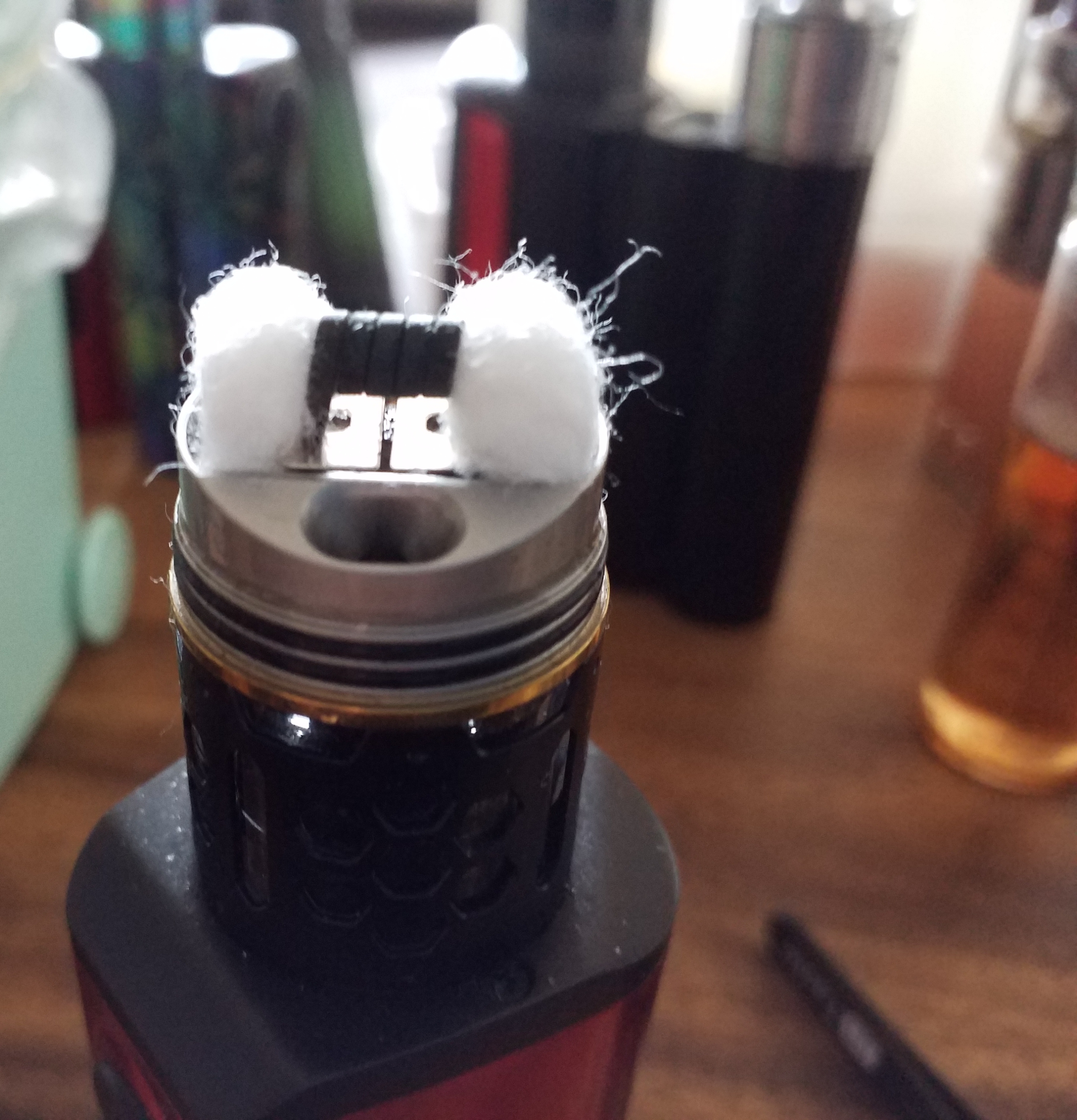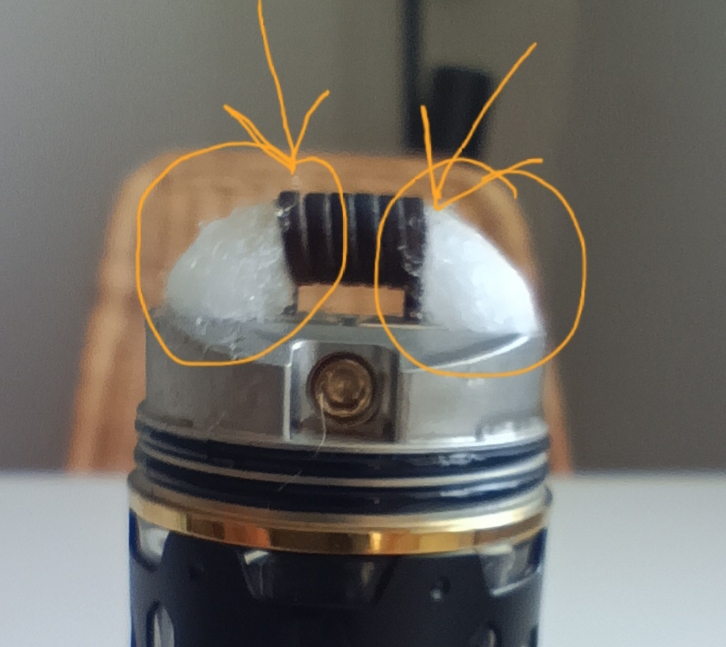 Ich drücke zum Schluß mit der Pinzette die Watte fest auf die Dochte und habe bislang noch nie einen Liquidabriss gehabt.