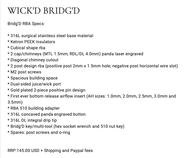 Die Bridg'd von Wick`d kann nun über Facebook geordert werden. Das Wickeldeck scheint dem der Vapeshell nicht ganz unähnlich, 3mm Coils sollen gut reinpassen. Hybrid Drip Tip, Button und ein Tool für den 510er Adapter liegen bei. Der Clou der Bridg'd ist, dass die AFC Inserts ausgetauscht werden können, selbst wenn sich der RBA in einem noch vollen Boro befindet. Meiner Meinung nach eine ziemlich geile Idee. Nicht ganz so geil finde ich die Größenauswahl der AFC Inserts, zwischen 1mm und 2mm fehlen noch 1-2 Varianten für die MTL-Crew...
