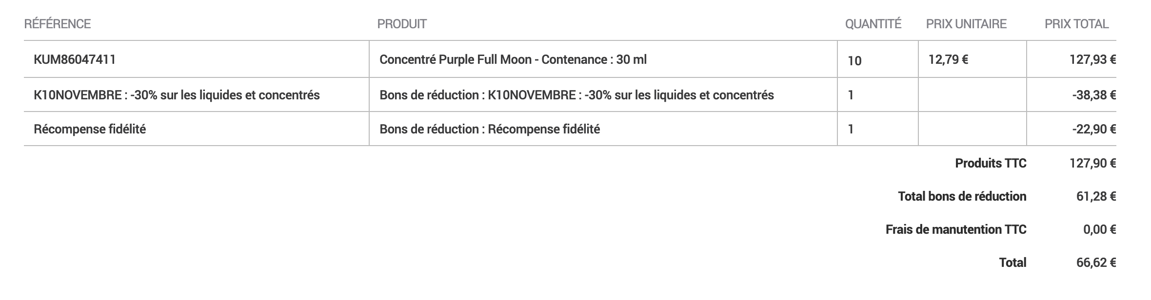 Damit hatte ich bei 10x 30ml Aromas in Summe 50% an Rabatt, das ist einmalig.