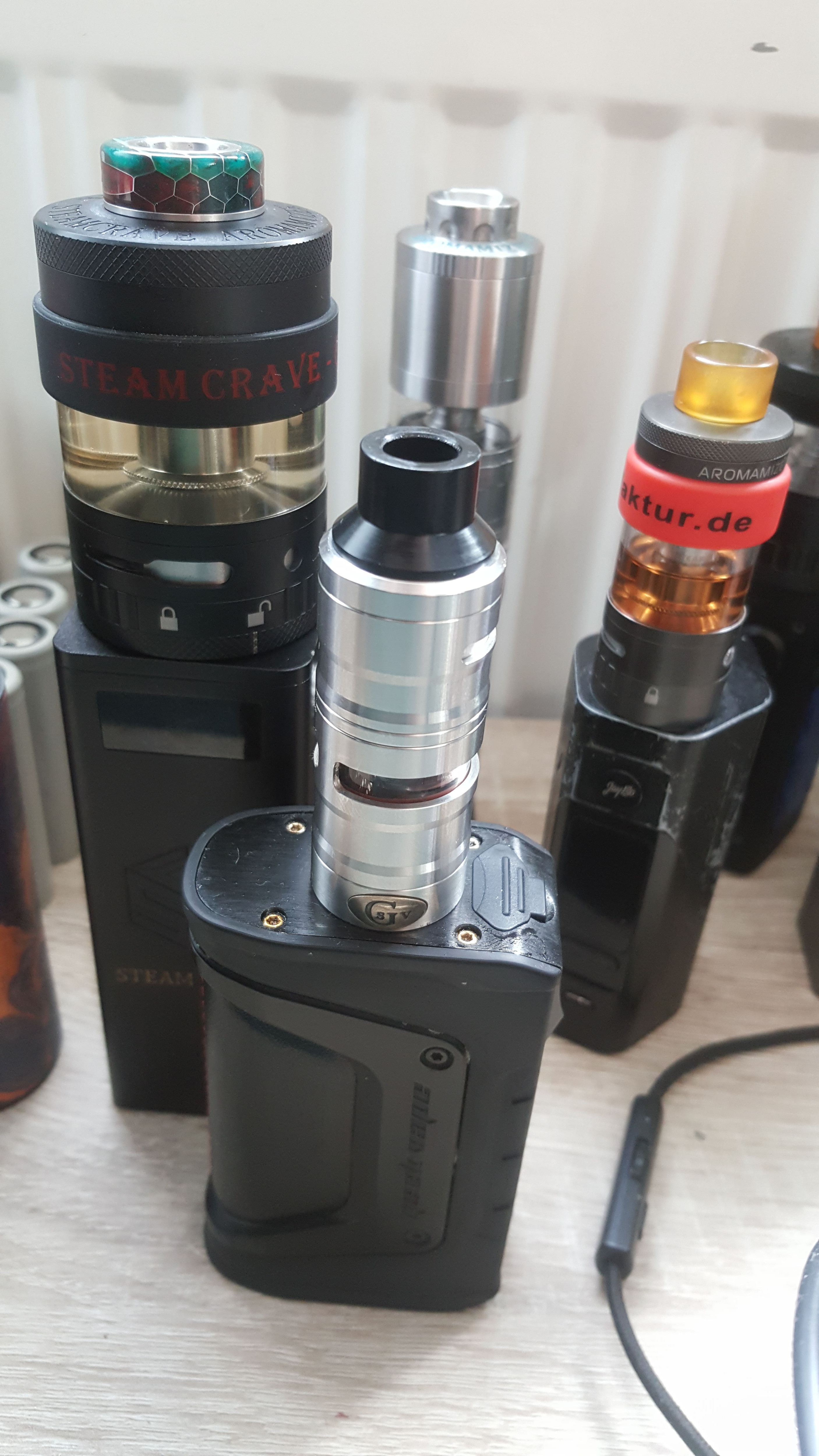 Nachdem ich nun arbeitsreiche Wochen und die 18ter-Geb.-Party "überlebt" habe, konnte ich mich endlich mal wieder Dampfkram widmen. Der nicht nur sehr kreative, sondern auch unglaublich nette fritsche hat mir ein kleines Konvolut an Verdampfern überlassen, über das ich mich sehr freue und heute dann endlich mal auspacken konnte. Neben einen "The sherman", einem Tinity Tronix V3 und einem Cloud Chaser Strife lag ein GSV² in dem Paket.