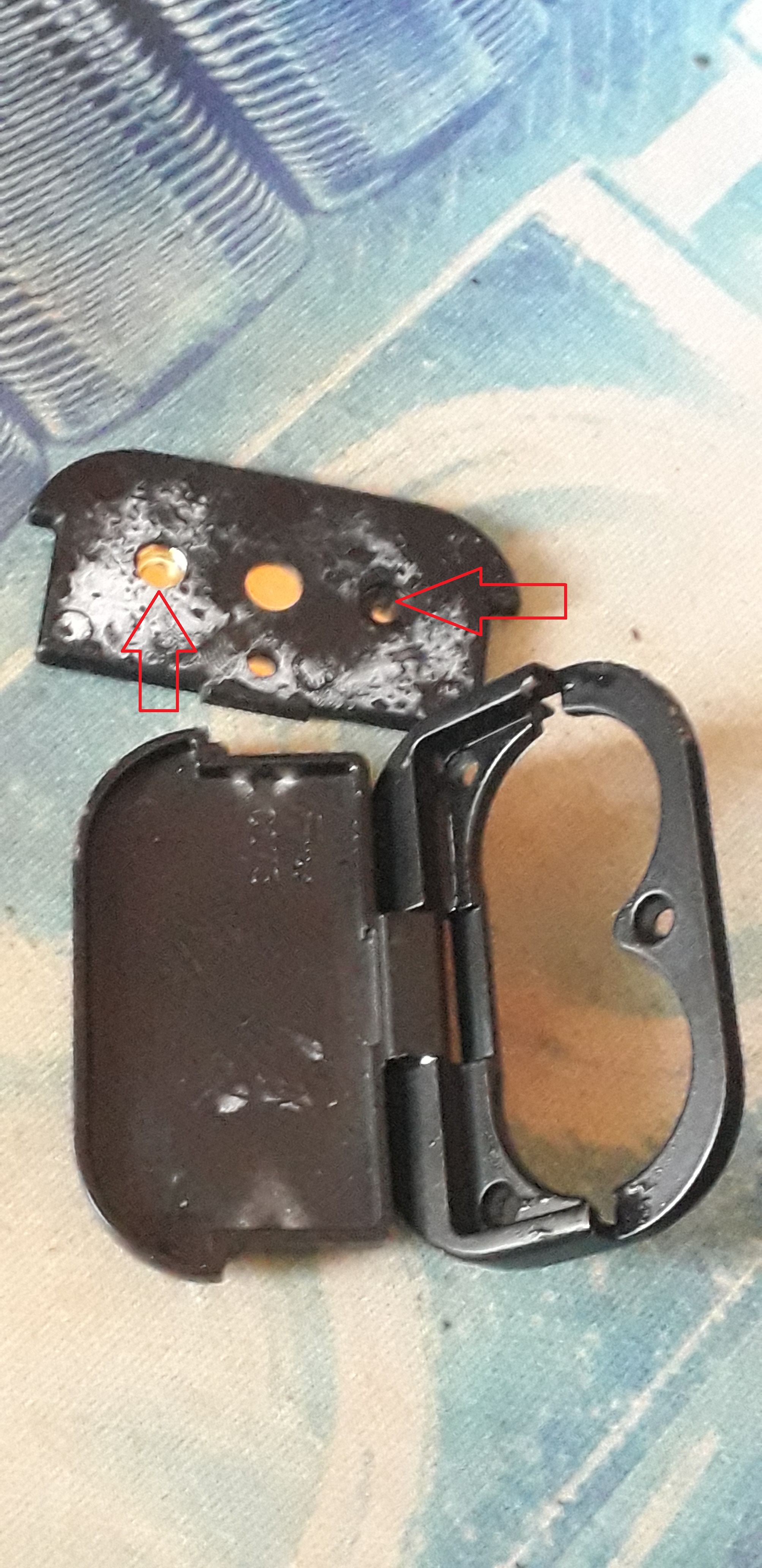 Die müssen besseren Kontakt kriegen, das kann man mit etwas "aufbiegen" hin kriegen. Z.B. einen Nagel oder Bohrer nehmen und die stumpfe Seite da aufsetzen. Auf dem Schraubstock (oder 2 stabilen Stäben) auflegen, so das unter den Stellen Luft ist. Dann leichte Hammerschläge, so das die Kontakte da etwas mehr "ausbeulen". Dadurch sollten die Akkus wieder Kontakt kriegen. Der kleine untere Punkt in der Mitte ist sicher für einen Stift, der zur Spannungsmessung da ist. Der Stift sollte gefedert sein und dort immer noch Kontakt haben, wenn nicht, auch den etwas aufbiegen.