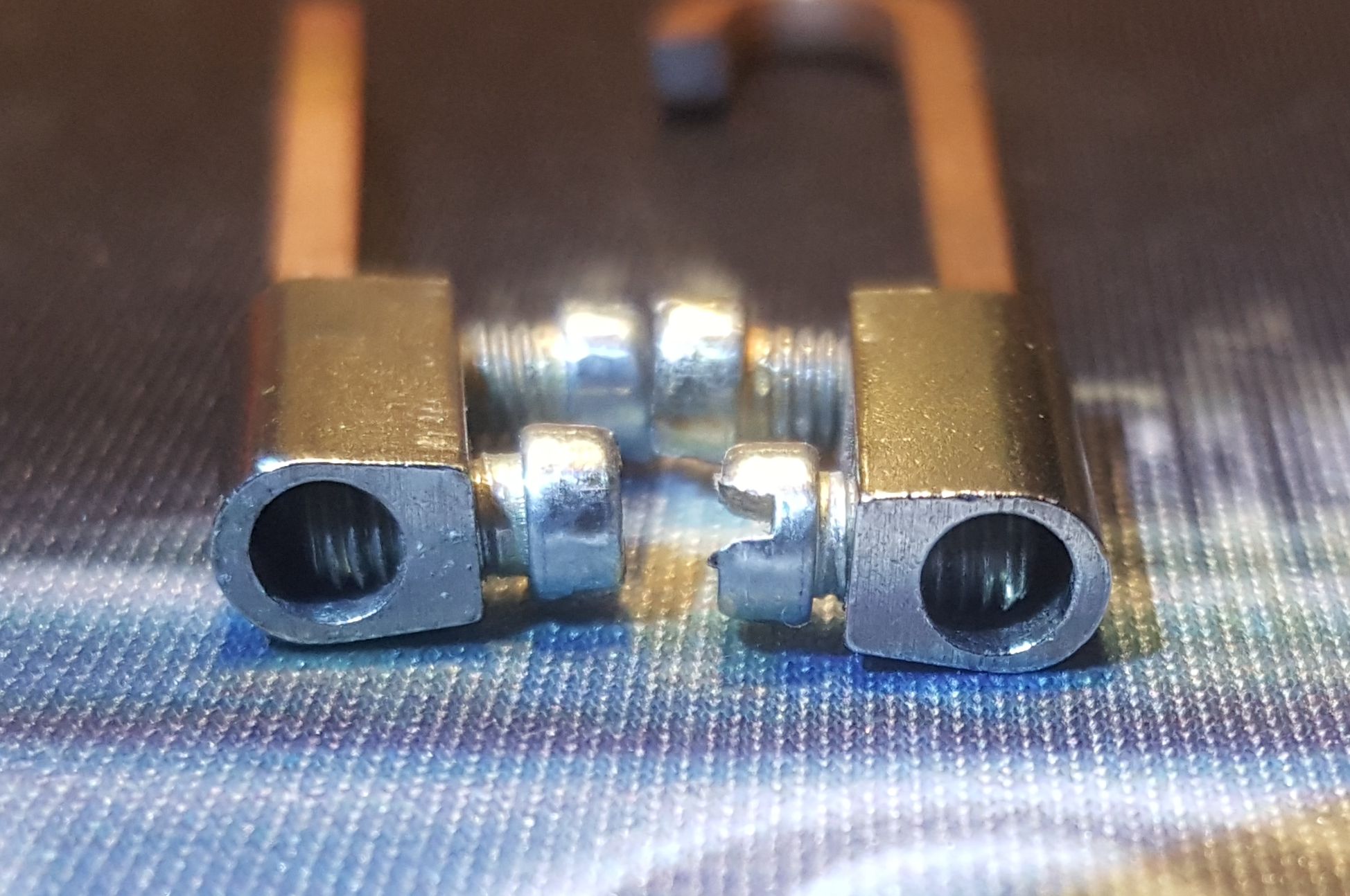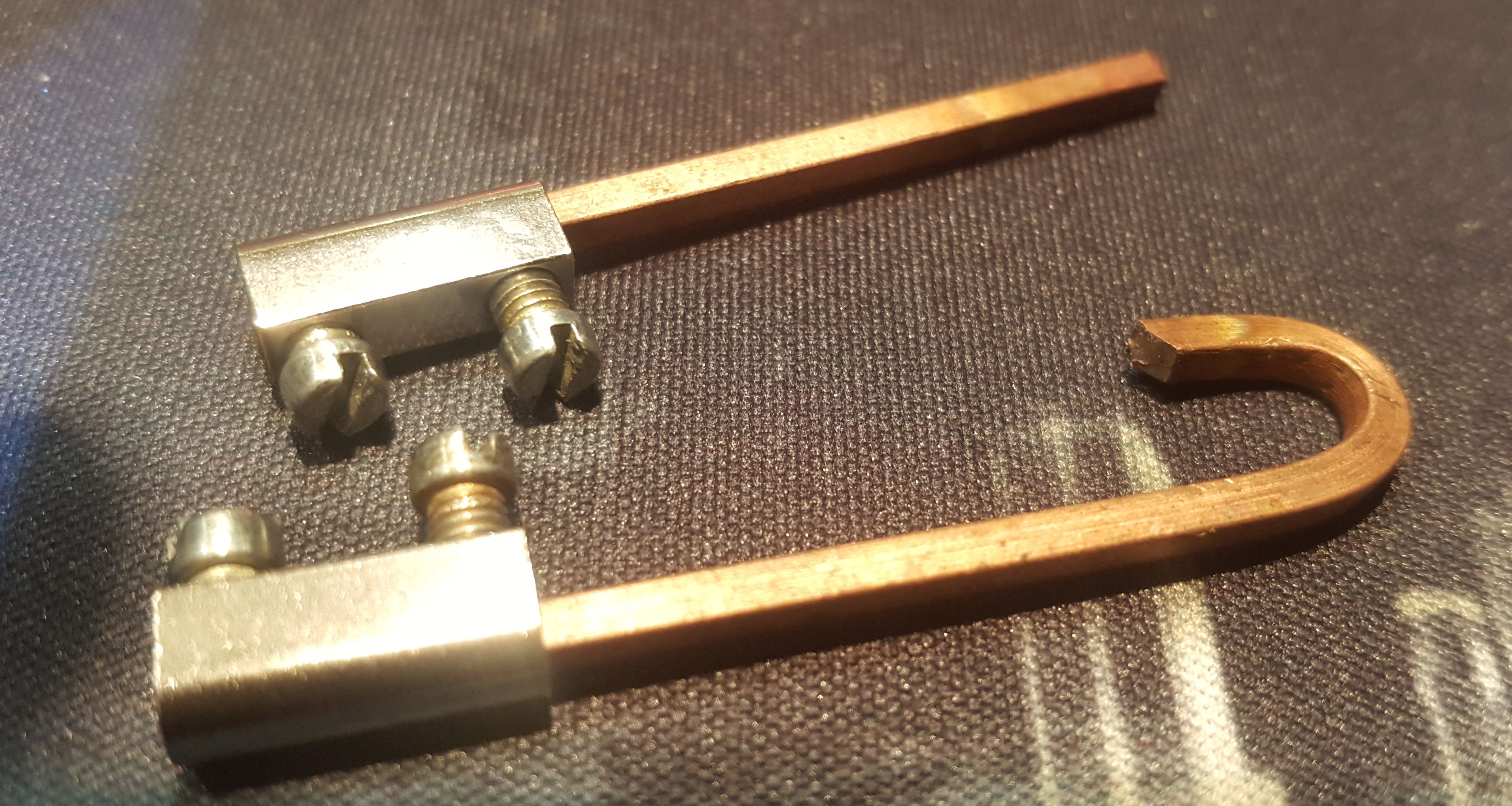 Da man (bzw ich) ja immer wieder gern das Problem hat, die Drähte sauber flach ins Bohrfutter oder den Wirbel zu legen, wenn es mehr als 2 sind, hab ich mir kurzerhand mal selbst was gebastelt, das mir gestern kurz vorm einschlafen im Bett ein fiel. Hab eine Lüsterklemme um 2 Klemmen erleichtert, dann die Plastikummantelung mit nem Cuttermesser entfernt und hatte dann 2 Klemmen mit jeweils 2 Schrauben. Ein schon seit Ewigkeiten in meiner Werkzeugkiste rum fliegendes Stückchen 4-Kant-Kupferdrahtstück wurde um 2 Stücke gekürzt, von denen eins dann einen Haken gebogen bekam. Raus kam dann dies:
