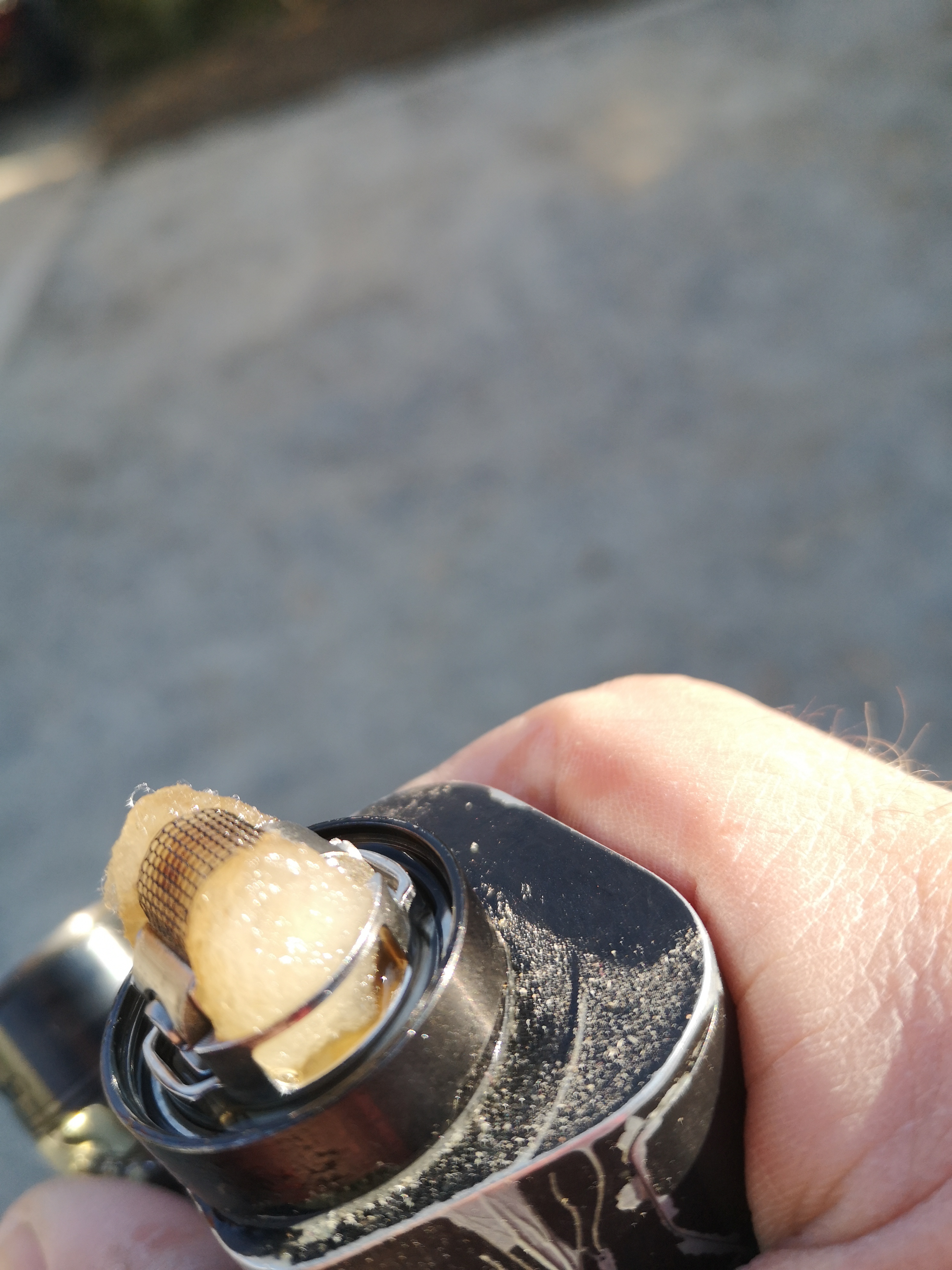 Watte sitzt locker, schon knapp am siffen in den Taschen, mesh glüht gleichmäßig von innen nach außen auf... Zudem liegt die Watte gleichmäßig ohne Zwischenräume am mesh. Nachdem ich die Watte neben dem mesh etwas hoch modelliert hatte wurde es etwas besser, allerdings nach 3,4 Zügen ohne größere Pause bzw nach langem ziehen kam es wieder.