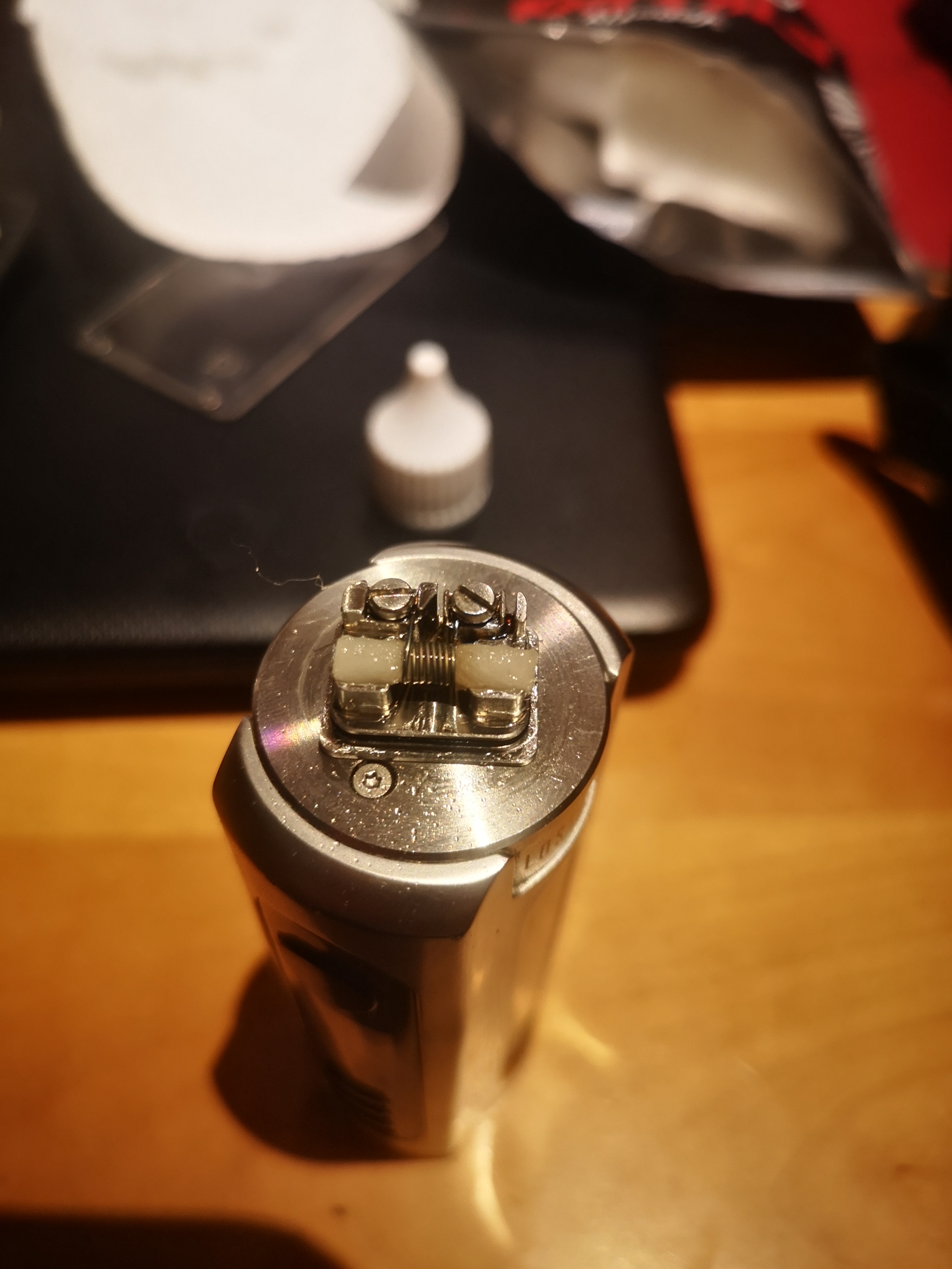 Die RBA ist eine Honeycomb und umschließt die Coil um gut die Hälfte. Das Liquid wird im Gegensatz zu z. B. der Augus ERA oder Dotshell von der Seite geholt und nicht von oben. Wickeln sowie Watte Verlegung ist sehr einfach und bietet Clapton und ähnlich großen Dräten genug Platz.