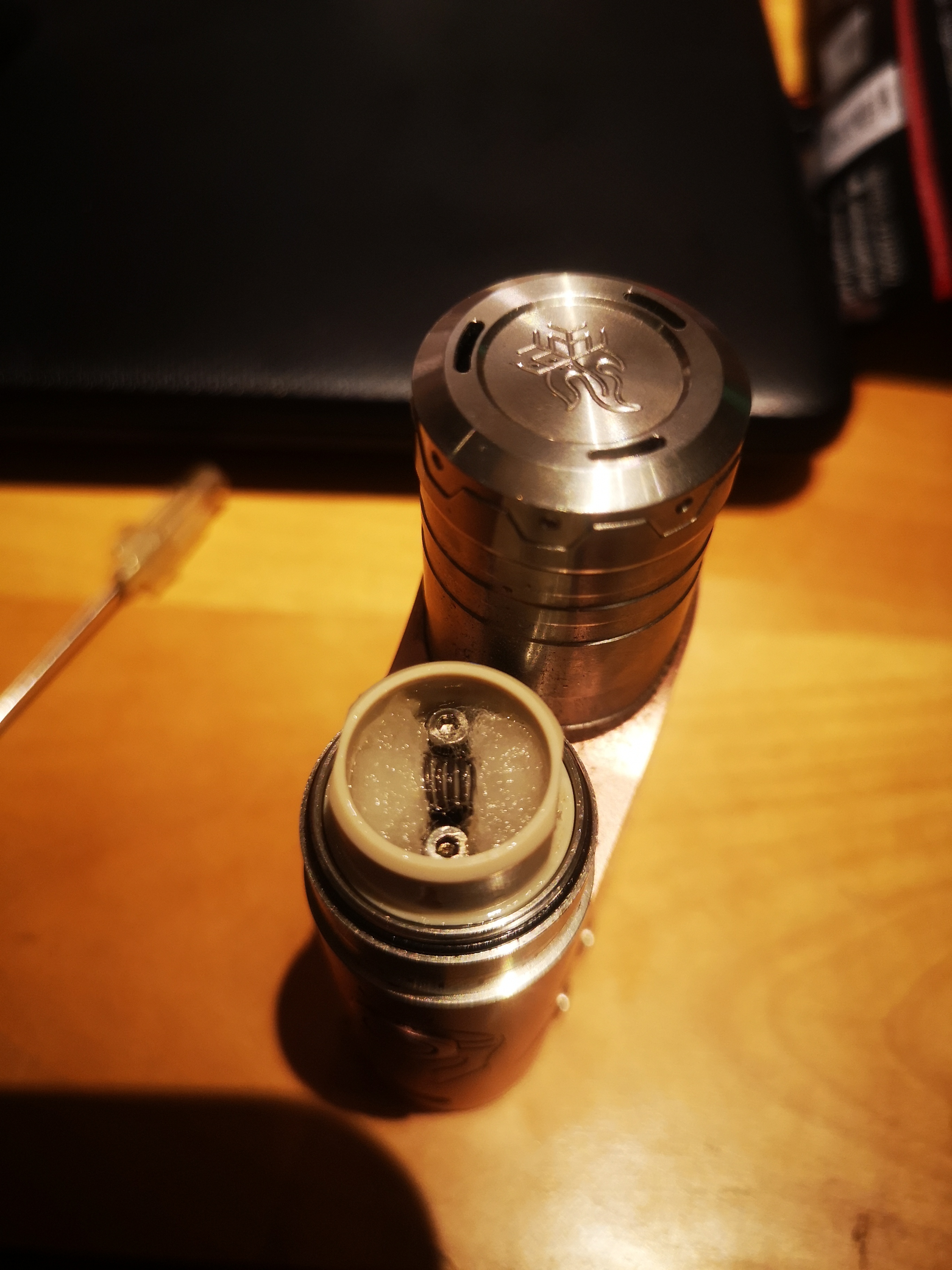 Die Halterung des Driptips dient zeitgleich als verschraubte Sicherung des Tanks, sitzt super und verhindert verrutschen.