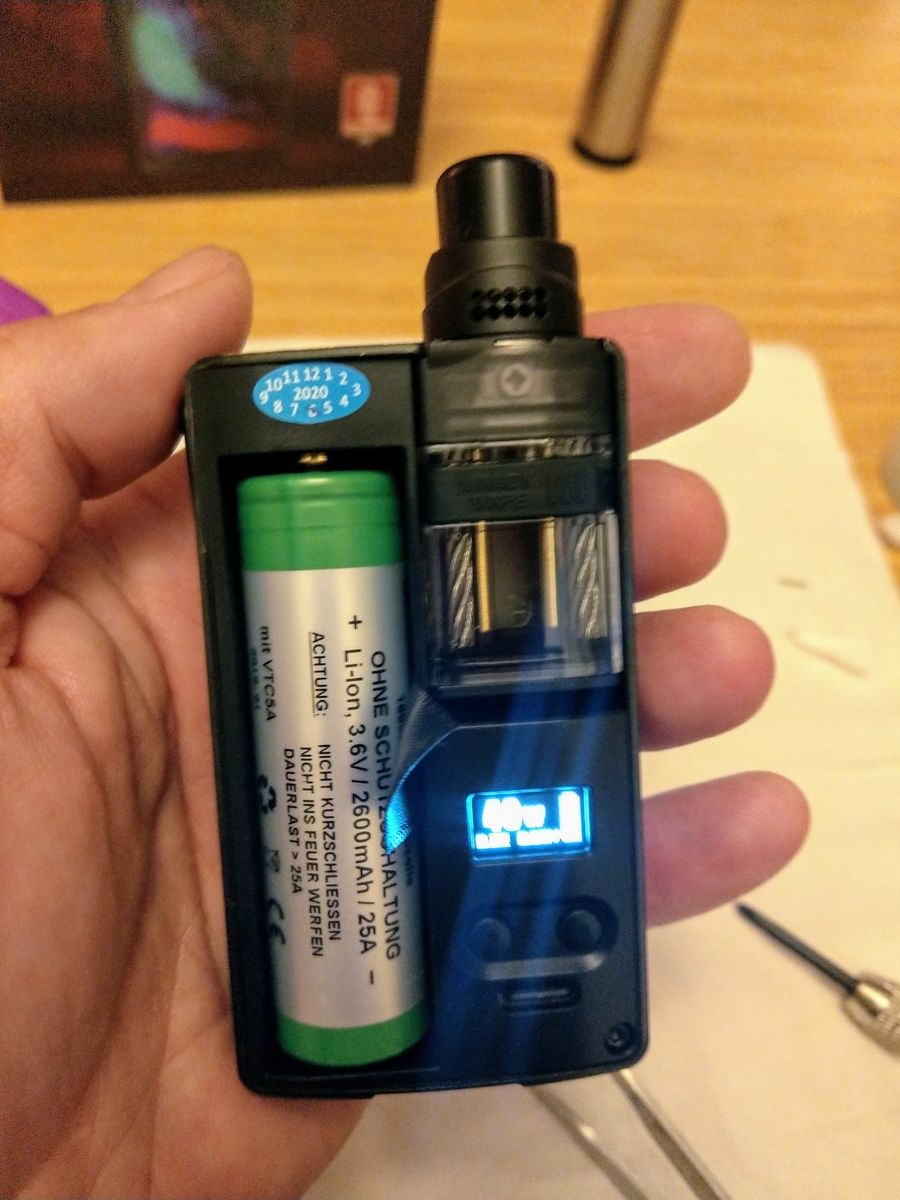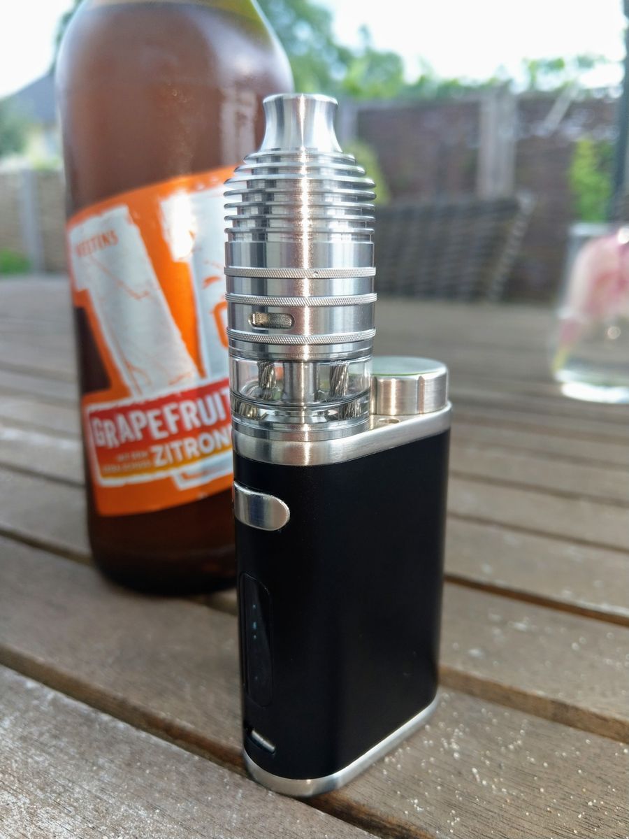 Regelbar bis 70 Watt, 18650er müssen rein, Driptip kann getauscht werden, die Airflow kann sehr gut verstellt werden. Bei leicht restriktiv ist aber Schluss, offener geht es nicht. Nichts wird heiß. Und es schmeckt in dieser Kombination einfach hervorragend.