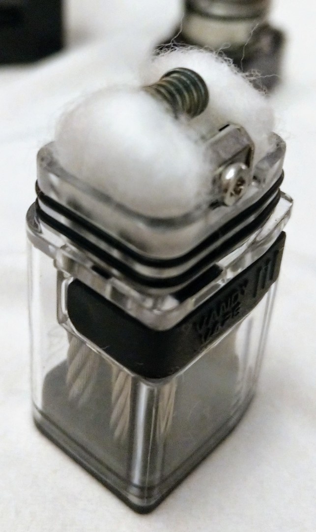 Gekauft habe ich die AiO aber wegen des Selbstwickelpods. Dieser ist wie ein kleiner Mato mit 4 Dochten ausgestattet, welche, nach dem lösen 2er Schrauben, die gleichzeitig Plus und Minuspol darstellen, problemlos von unten in die vorgesehenen Löcher gesteckt werden können.