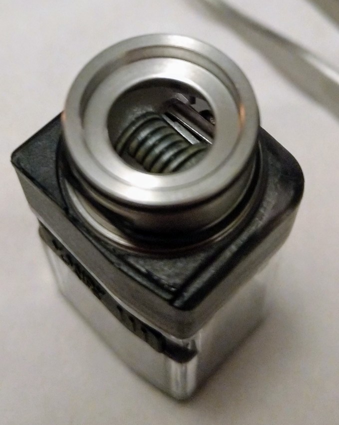 Um den Tank, nach dem Ausglühen im Gerät selbst, wieder hinaus zu bekommen, gibts einen kleinen Griff, welcher gleichzeitig ein Maß für einen passenden Meshstreifen wäre.