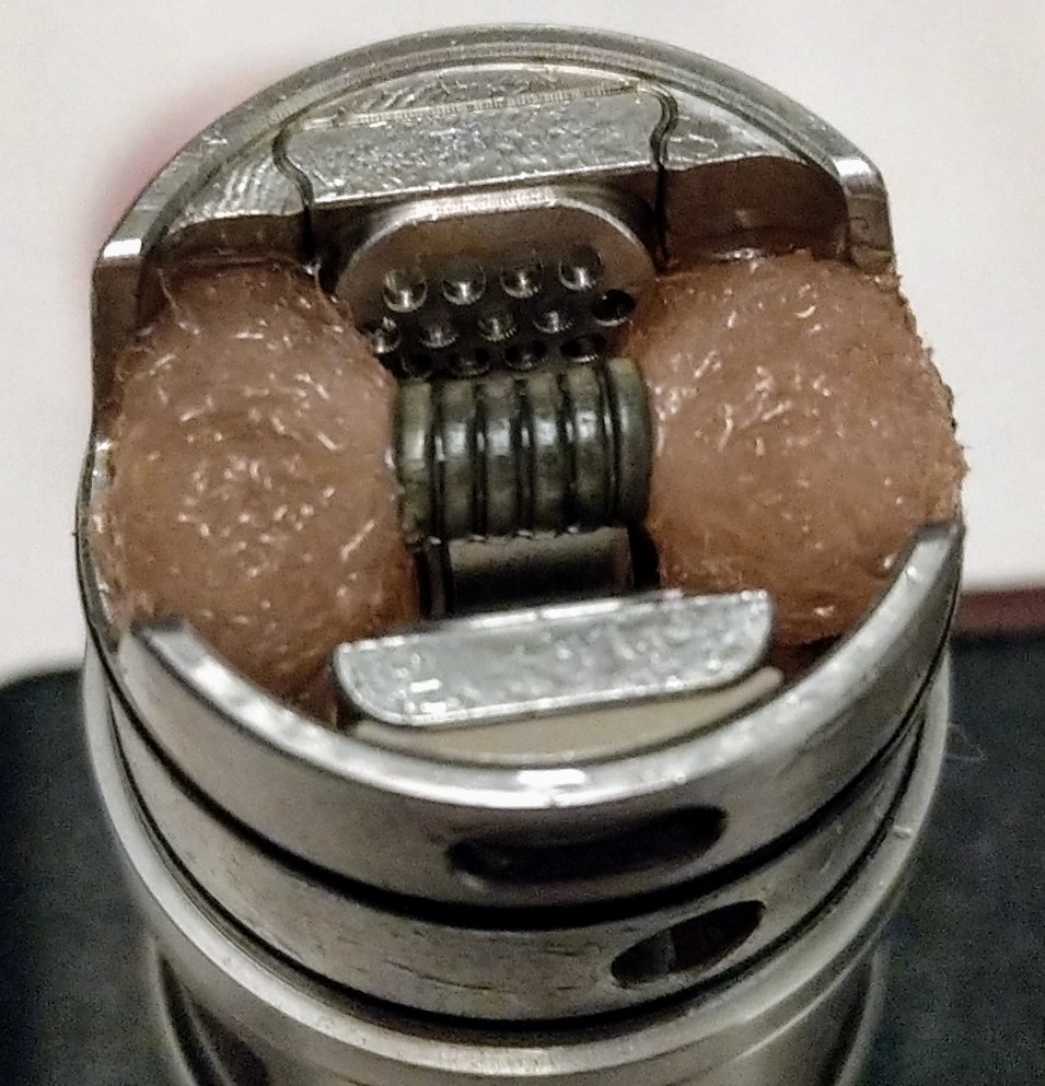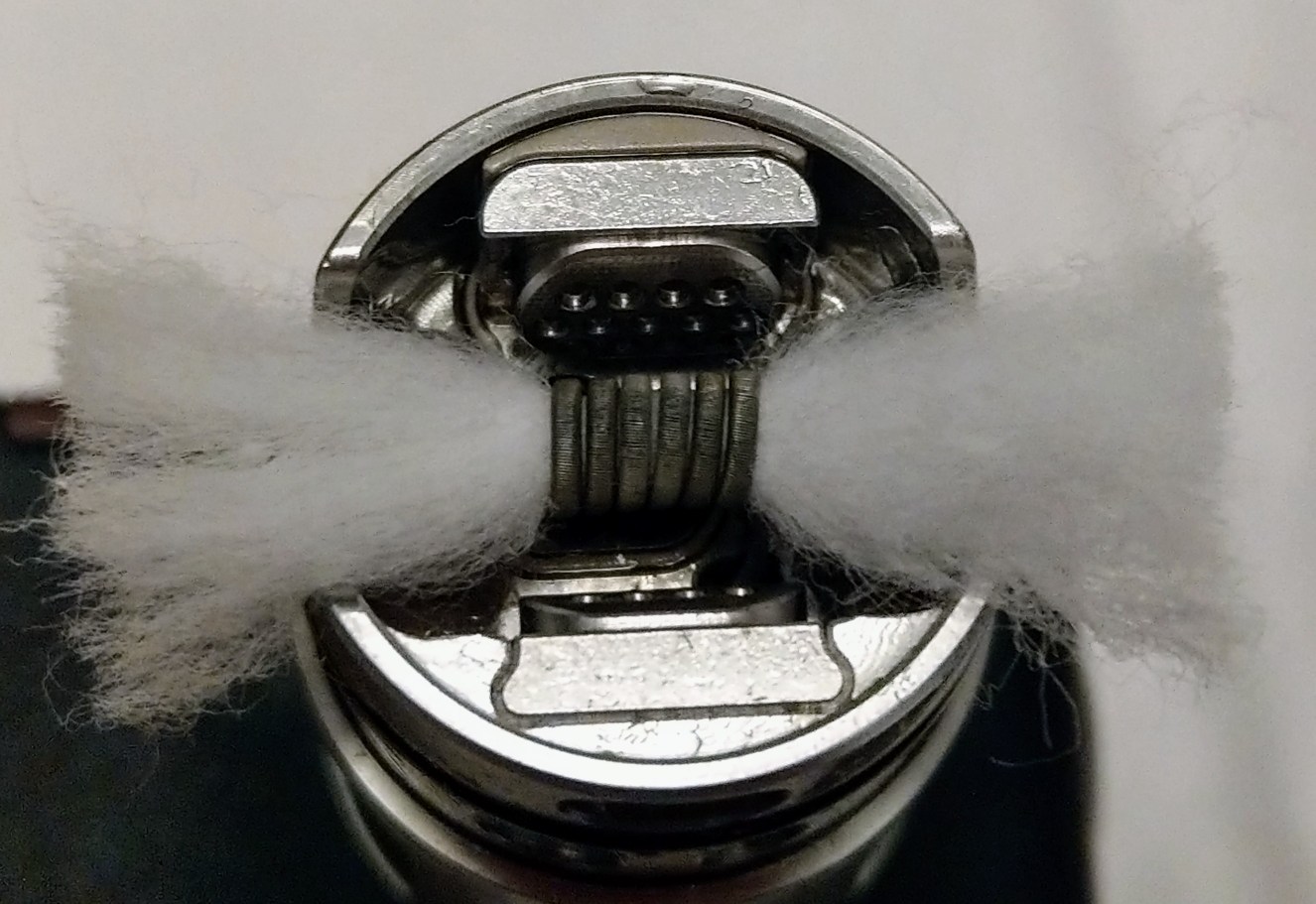 Sie stehen ca. 2-3 mm raus. Also hab ich, wie beim Taifun GX gesehen, Watte drum gefriemelt. Und dann erst die Watte durch die Coil draufgestellt.