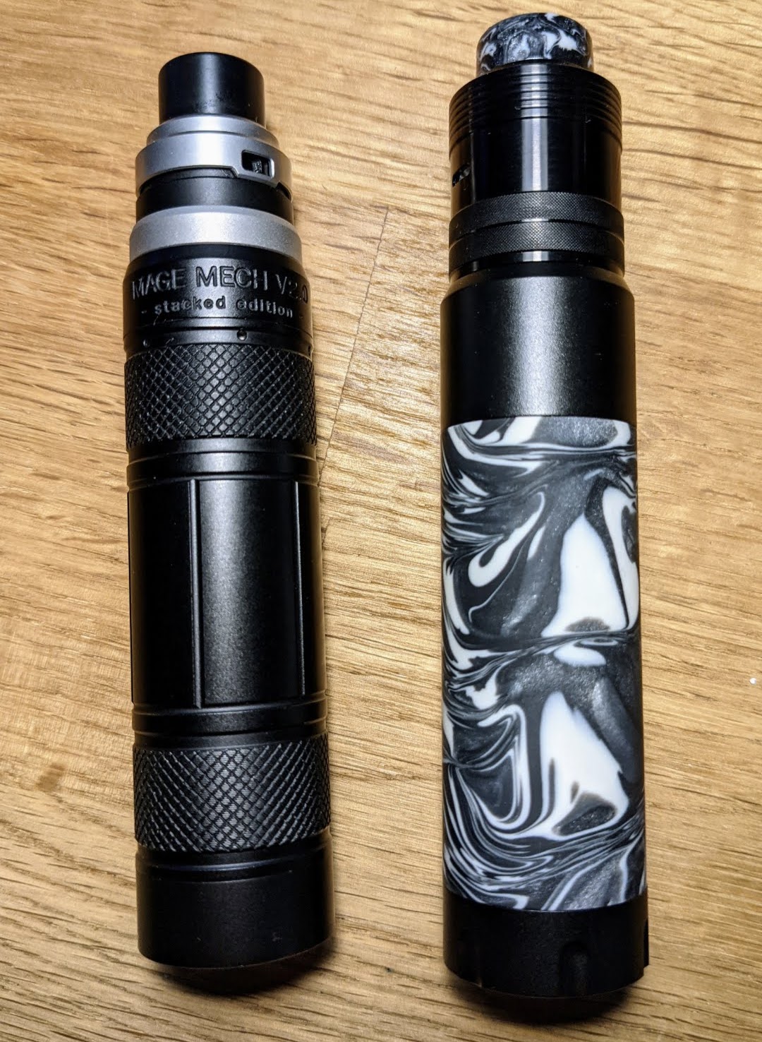 Links: CoilART MAGE MECH V2.0 Stacked Edition, für 21700er, kommt mit einer Verlängerungshülle zum Stacken, Messing mit haltbarer Beschichtung. Läuft bei mir in der Rotation seit 3 Jahren