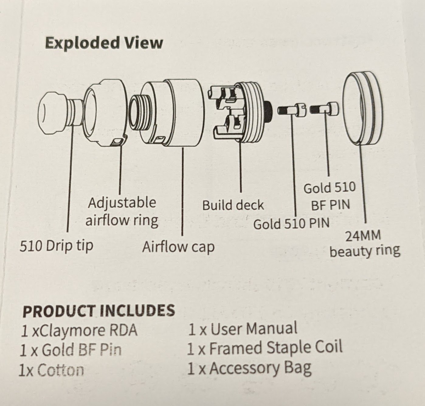Im Lieferumfang sind Ersatzschrauben, O-Ringe, 2 schwarze Drip Tip 510, Bottom Feeder Pin, 1 Framed Staple Coil mit ID 3mm, Watte und Tools.