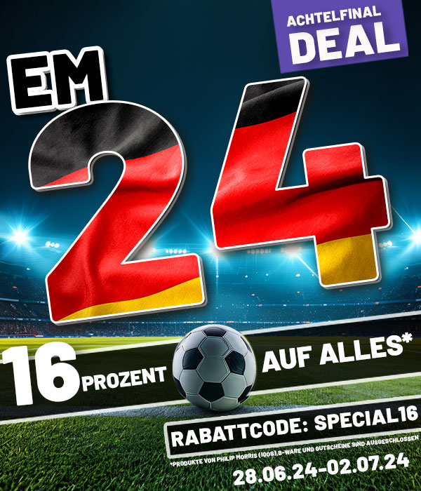 während der gesamten EM-2024 profitierst du von unseren EM-Rabatten. Wir bieten dir zahlreiche Angebote, um die nächsten Spiele noch spannender für dich zu gestalten. Sichere dir bis zum 23. Juni satte 11% Rabatt auf unsere E-Liquids Riccardo Classic, Red Dragon, New Firecastle, HighTense