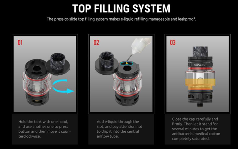 Der Topfill Mechanismus funktioniert wunderbar und die Topcap schwenkt dabei wirklich butterweich. Auch sie sitzt fest am Tank und wackelt nicht. Im Betrieb hält der Verdampfer stets dicht. Auch die Airflow bleibt trocken und es bildet sich kaum bis kein Kondensat rund um diese. Die Zielgruppe dieses Verdampfers ist