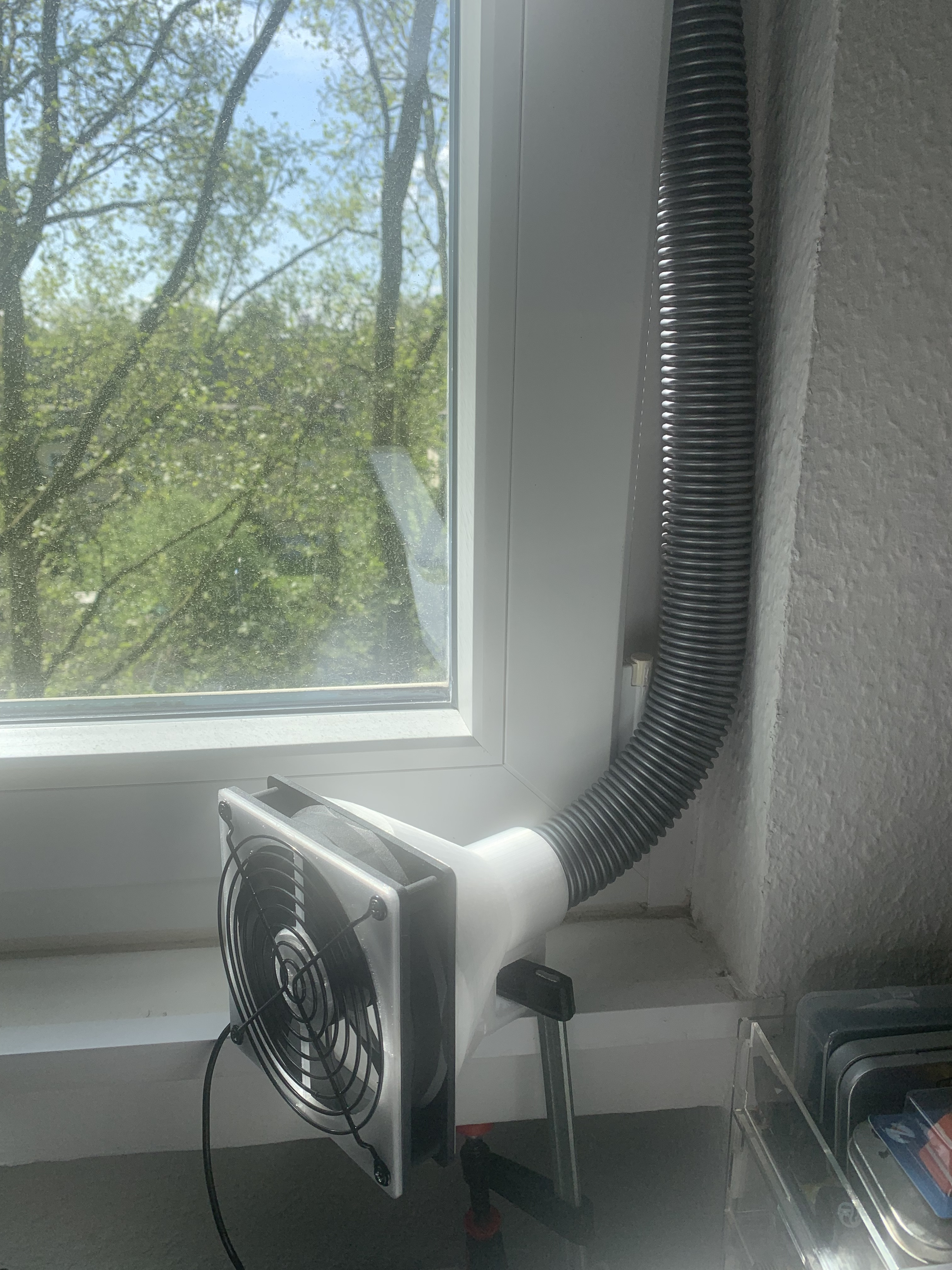 Der bekommt am Auslass noch einen zweiten Lüfter, dann sollte es voll scheunentorfähig sein. Ist auch skalierbar für größere Lüfter. Mann muss nur irgendwie den Schlauch nach draußen führen.