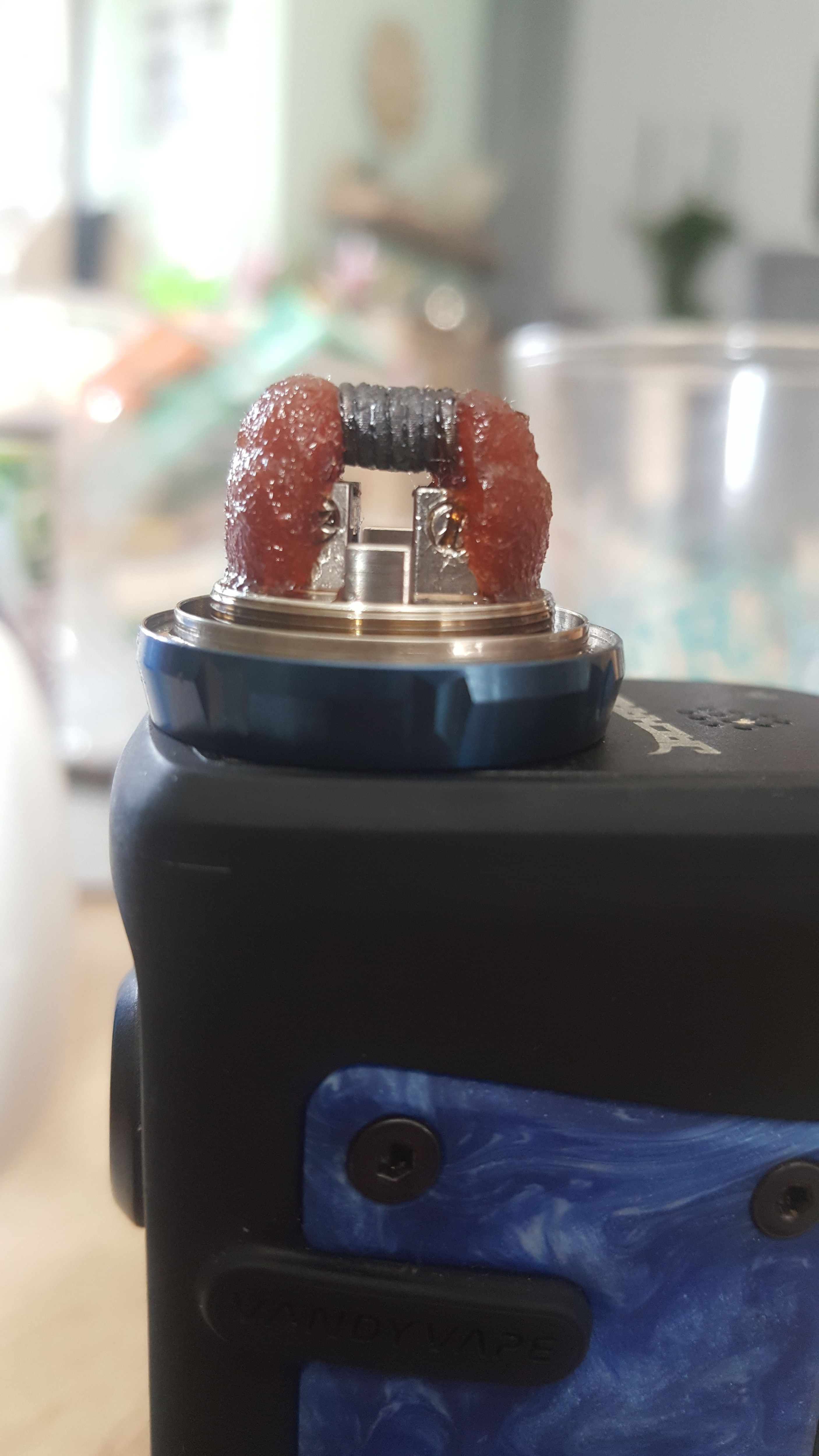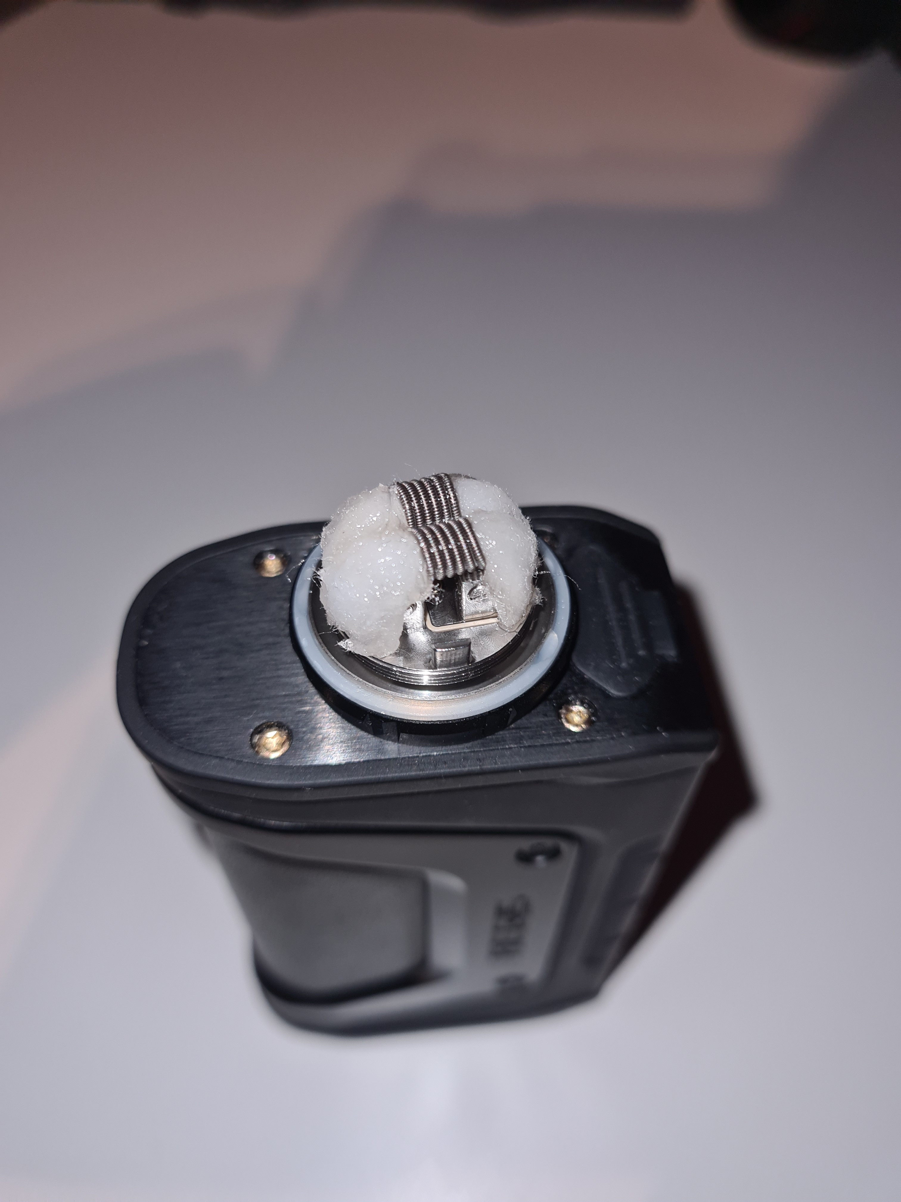 Die coils sind bei mir 3mm id und die Oberkante ist 11mm überm Deckboden. Die Watte ist bissl ausgedünnt und reicht bis ganz unten in die Taschen. Und nicht wundern, der steht schon ne ganz Zeit in der Vitrine, schmeckt aber immer noch gut so wie er ist, hat sich nur das Liquid bissl verfärbt