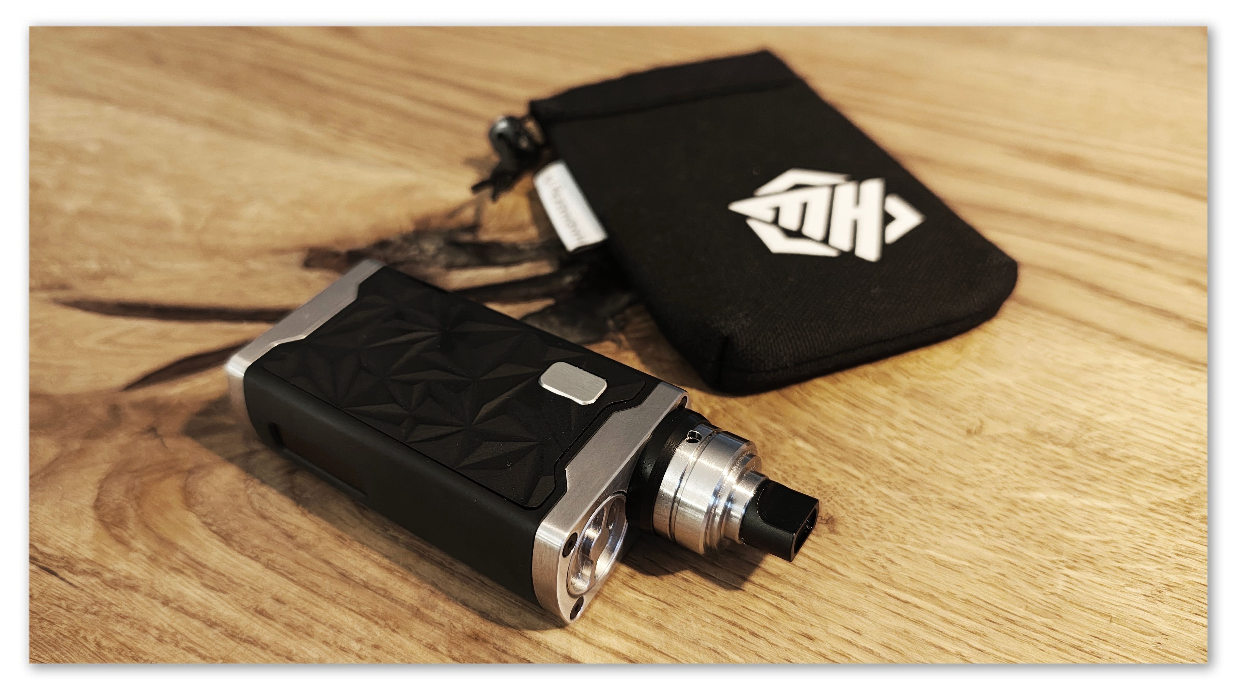 Die Box kommt in einer schicken Schachtel, in der Schachtel sind die Box, die Umbauteile (zu NONSquonk) und eine paar Schrumpfschläuche für 18650 Batterien. Eine Squonkflasche gehört natürlich auch zum Lieferumfang.