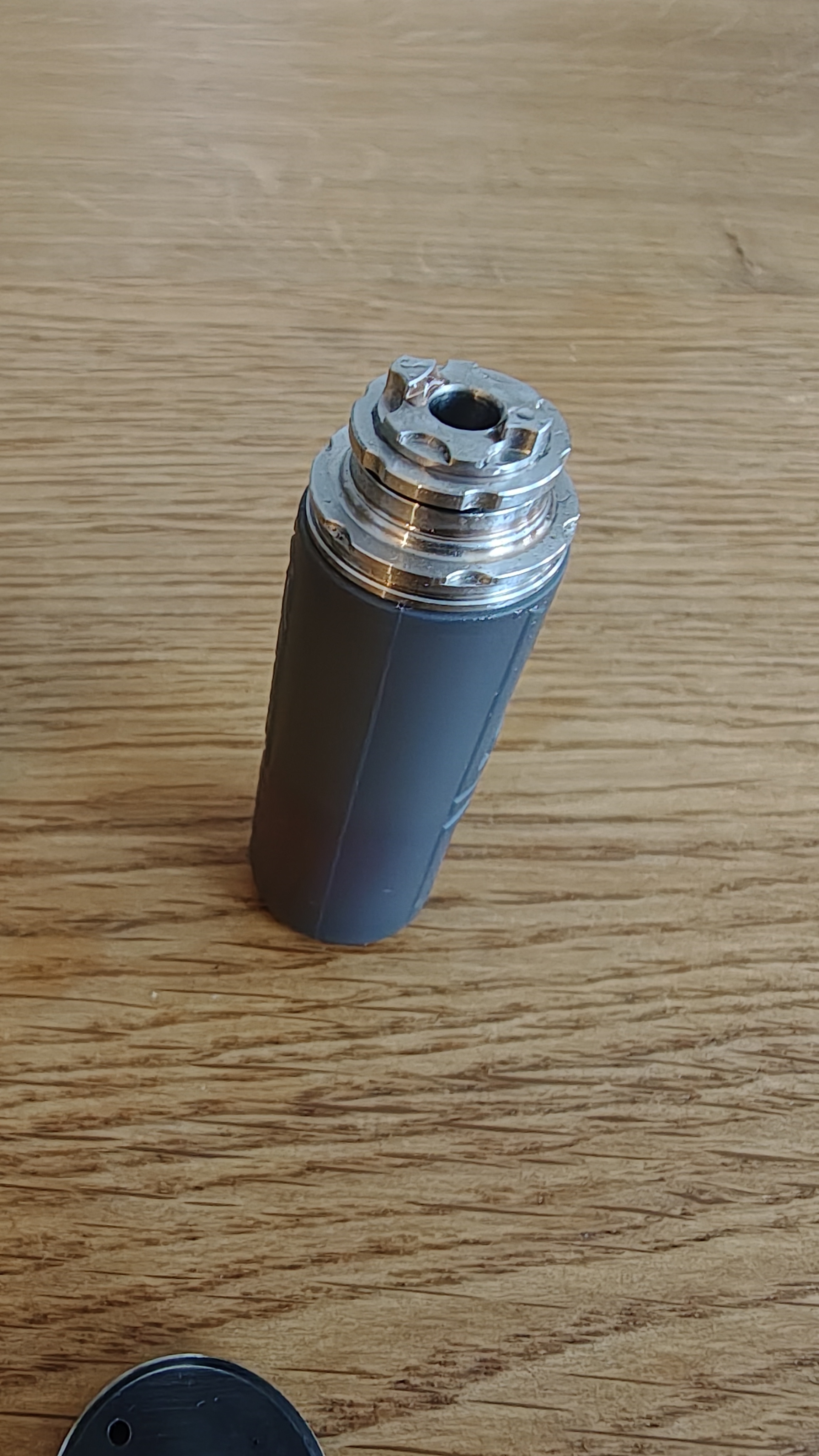 Die Silikonflasche und 3 Teilen aus Edelstahl. Ein Röhrchen im Verbund mit anderen Teilen, die die Flasche (dicht) halten und von unten über den 510er geschoben wird.