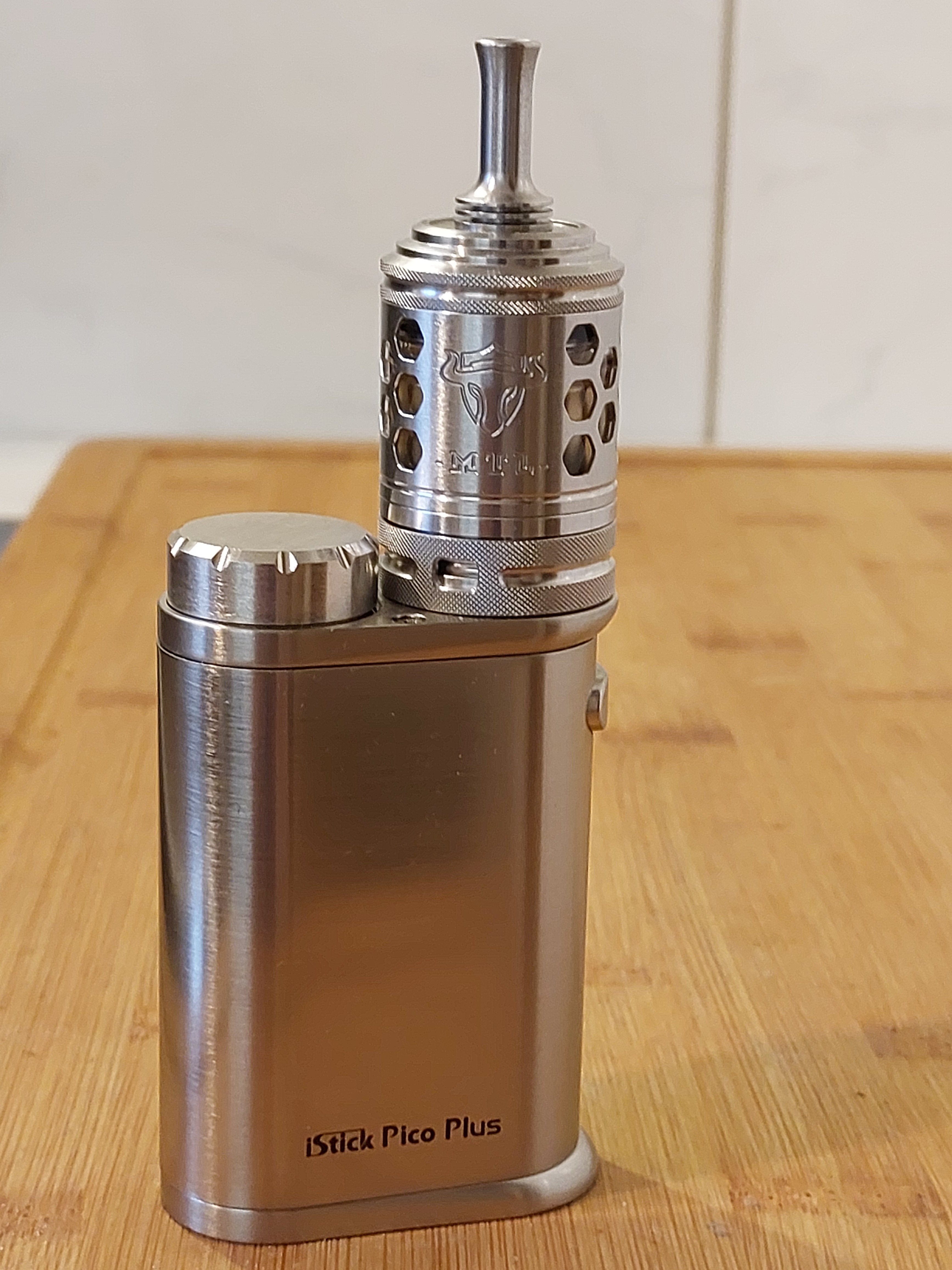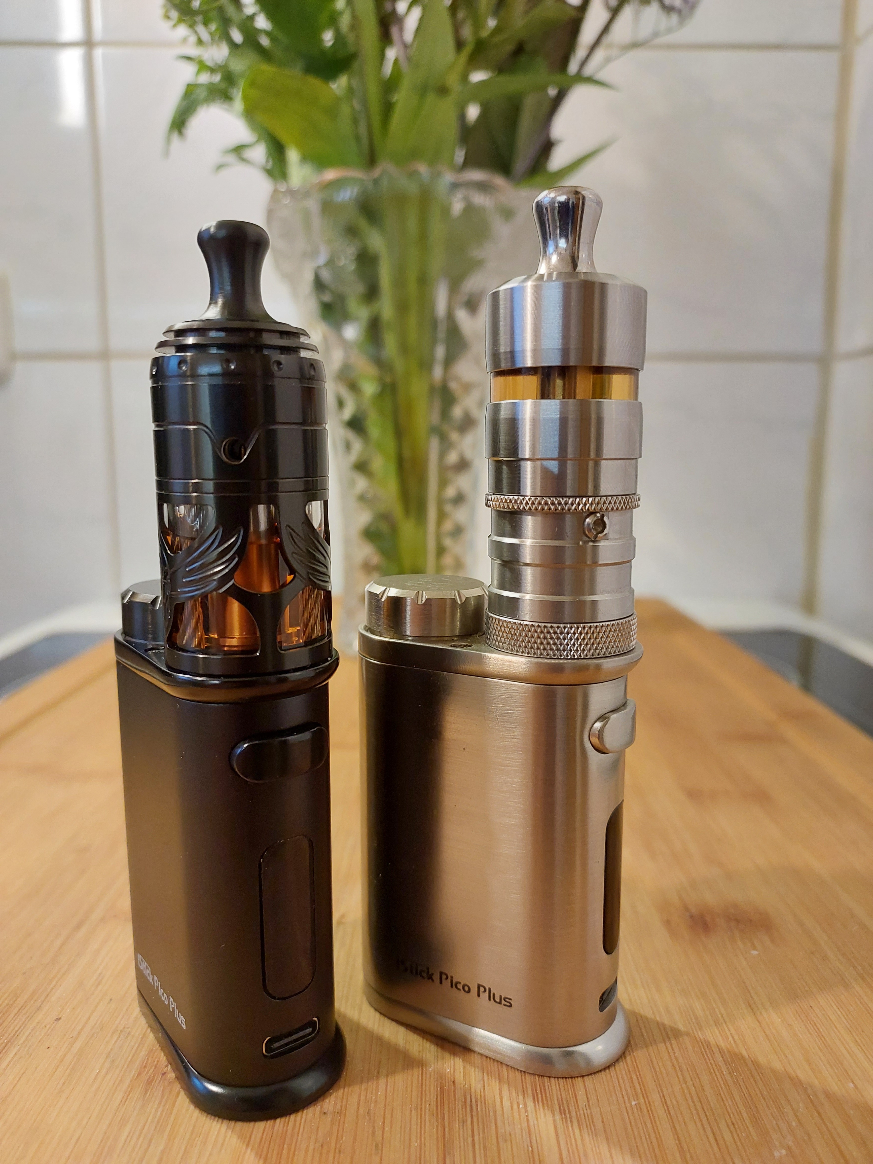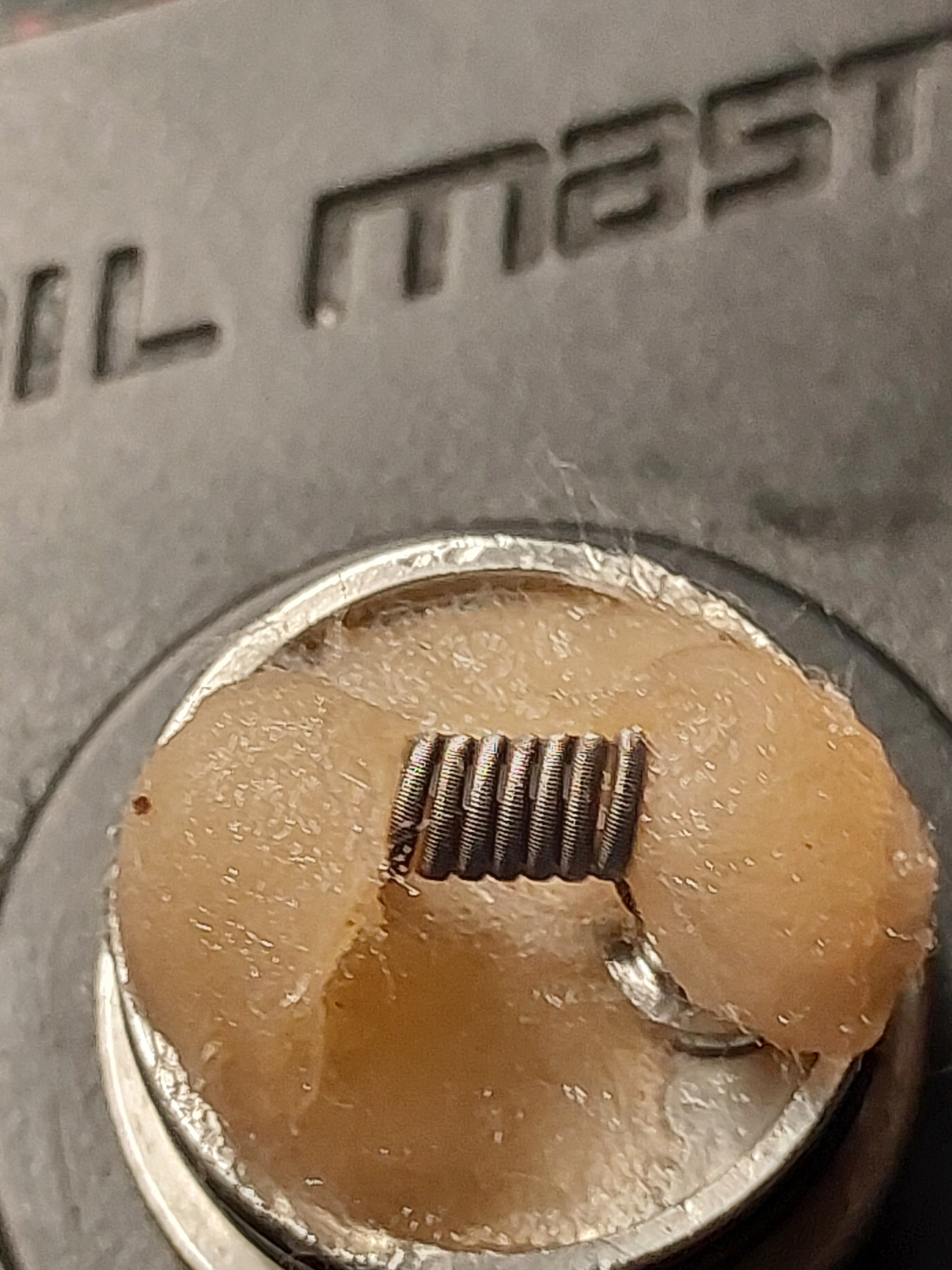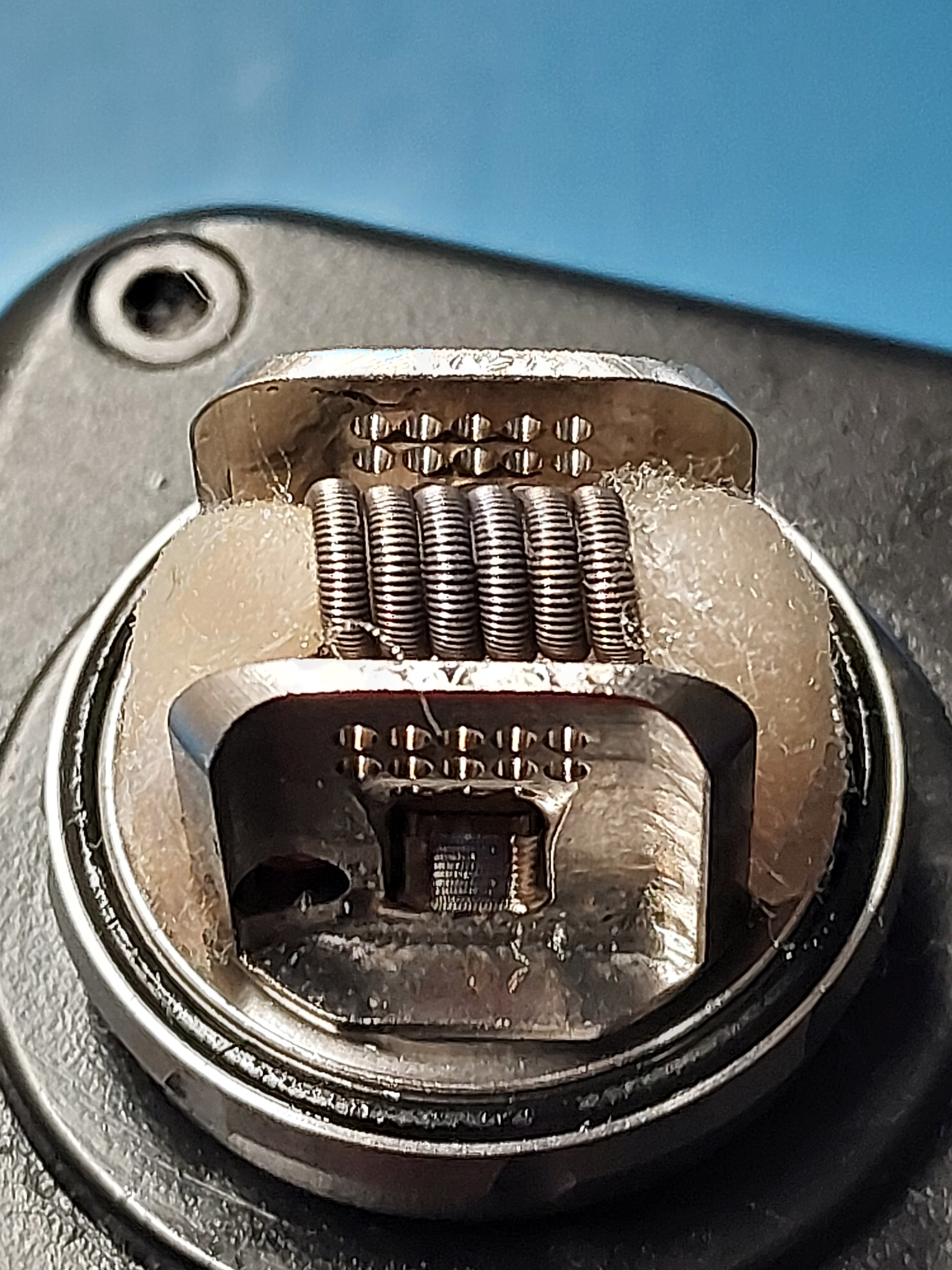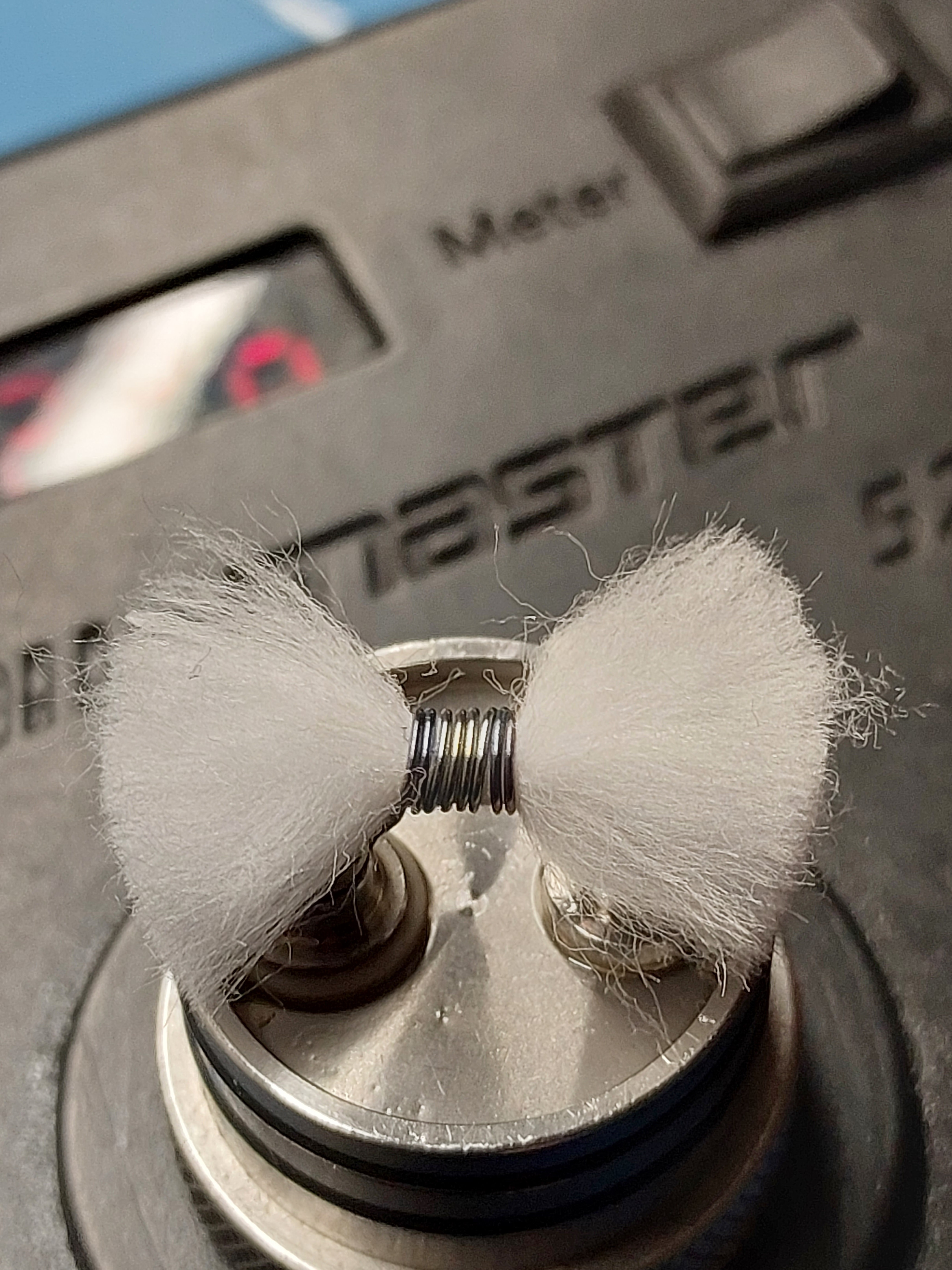Richtig guter Geschmack. Lag im Bunker, weil er sehr klein ist und das Deck samt Wattetaschen eine Herausforderung beim Wickeln für mich ist mit den häufigen Augenentzündungen. Habe ihn deshalb weit weg gelegt. Heute aber mal Zähne gezeigt, aufgeben ist ja auch keine Lösung. Nach 2. Anlauf alles prima. Der erste Anlauf brachte keinen Erfolg. Wenig Nachfluss, Watte trocken. Jetzt dampft es, knistert leise und schmeckt, Nachfluss 1 A. Vom Geschmack her mein bester MTL RTA, aber anspruchsvoll, finde ich. 1,2 Ohm, 10 Watt.