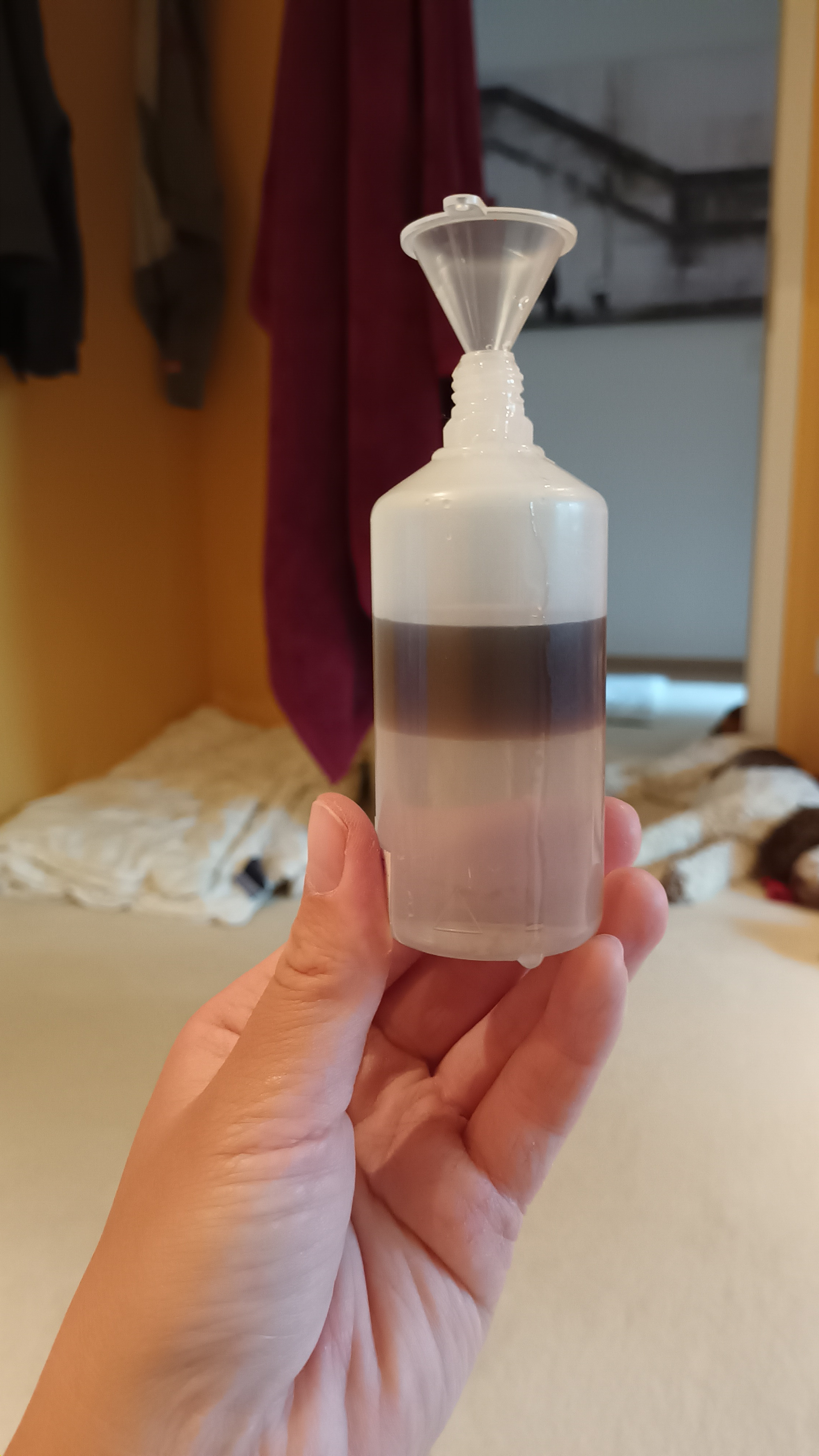 Ihr lieben, ist es normal, dass sich das Cappuccino Aroma, beim hinzugeben von Base, merkwürdig abtrennt? Es wirkte wie Öl in Wasser. Habe das bisher noch nie beobachtet. Hier hatte ich das Aroma schon mit etwas Base geschüttelt und dann wie zu sehen, weitere Base hinzugegen