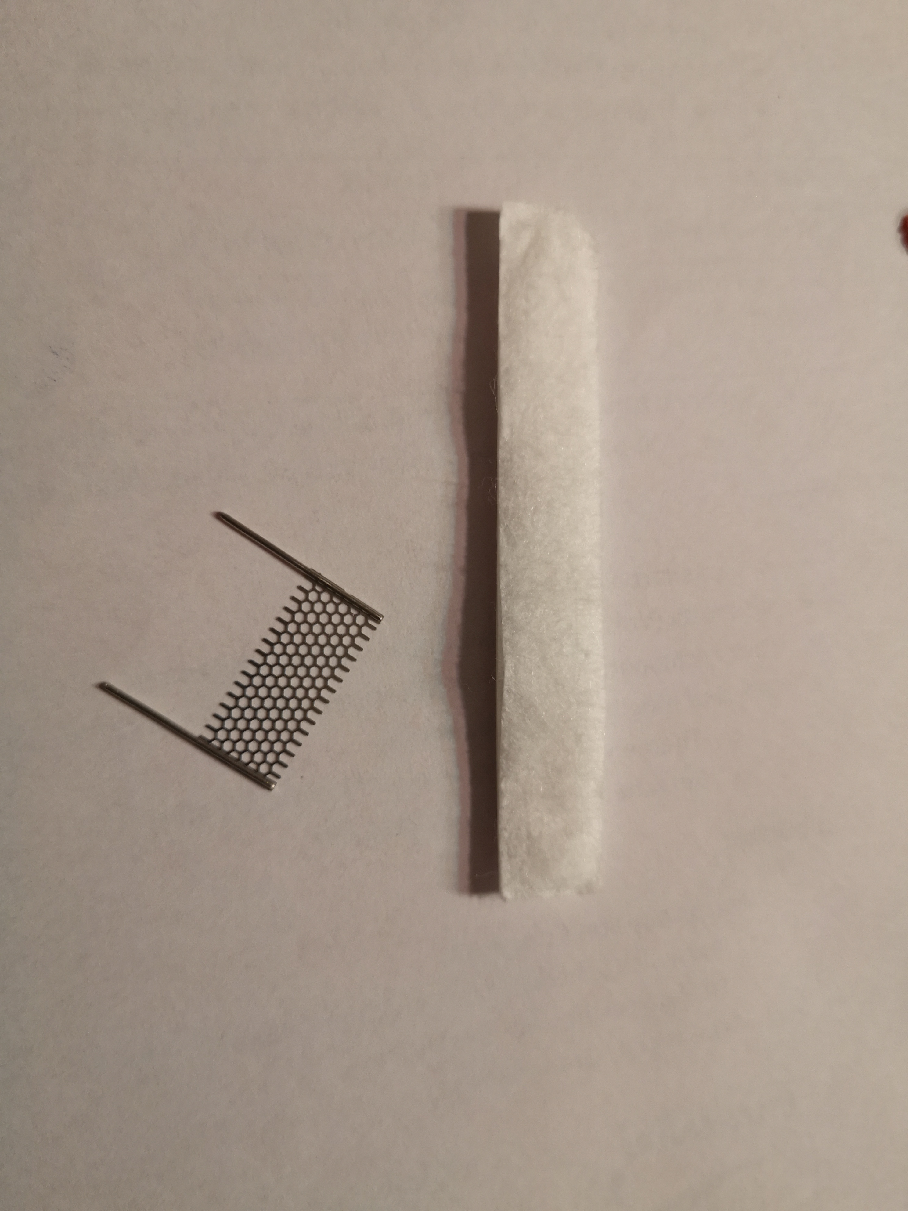 Ein dünner Wattesstreifen und das Mesh-Teilchen mit Beinchen.