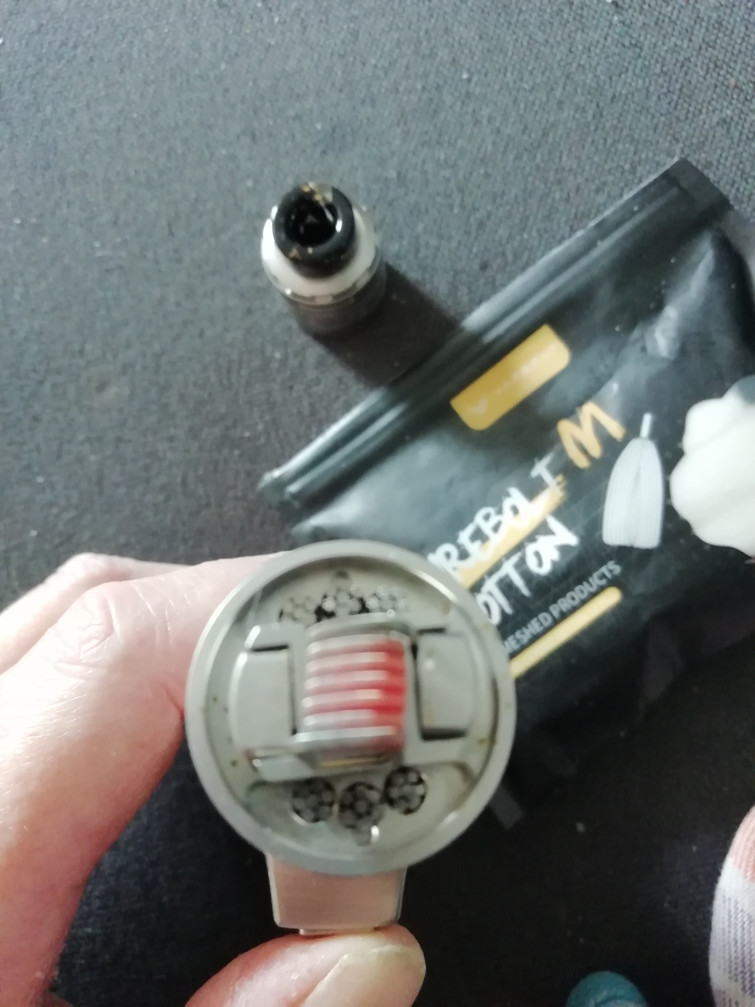 Also den gefederten Peek "Isolator", der in der Mitte die Watte ans Mesh drückt, rausgeschraubt und schon war das Deck bereit, meine 5mm Ni80 Clapton Fertigwicklung (2*26ga+38ga) mit 0,65 Ohm aufzunehmen. Noch schnell bewattet (bei einer 5mm Wicklung stellt es zum Glück kein Problem dar, dass genügend Watte zum Ausfüllen der Wattetaschen vorhanden ist), die Watte mit Liquid getränkt, den Tank befüllt und schon war der TCX bereit für den ersten Dampftest. Und was soll ich sagen: Nicht nur, dass mir der Verdampfer damit recht gut schmeckt (dampfe ihn auf 54W); auch liefert die Coil ein unheimlich dumpfes Crackling, was mir als Crackle-Fanatiker natürlich besonders gut gefällt.