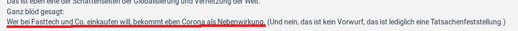 Der Satz obendrüber, den du halb abgeschnitten hast, setzt es in einen Kontext, wirklich einordnen kannst du es nur mit dem ganzen Absatz darüber, und da steht nicht, dass irgendjemand persönlich an irgendwas schuld hat, da steht etwas von einer Vernetzung der Welt, von Verdichtung von Wohnraum und der Beschleunigung von Mobilität, deren Zuspitzung die Möglichkeit ist, Dinge von einem anderen Kontinent zu bestellen.