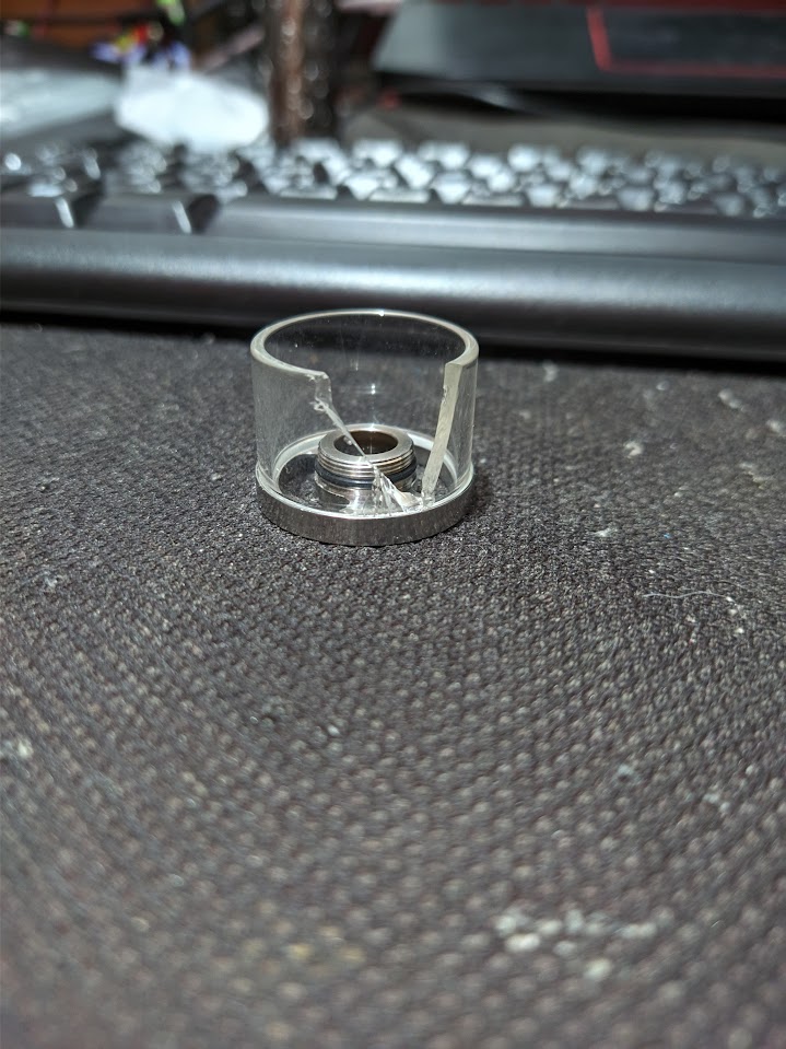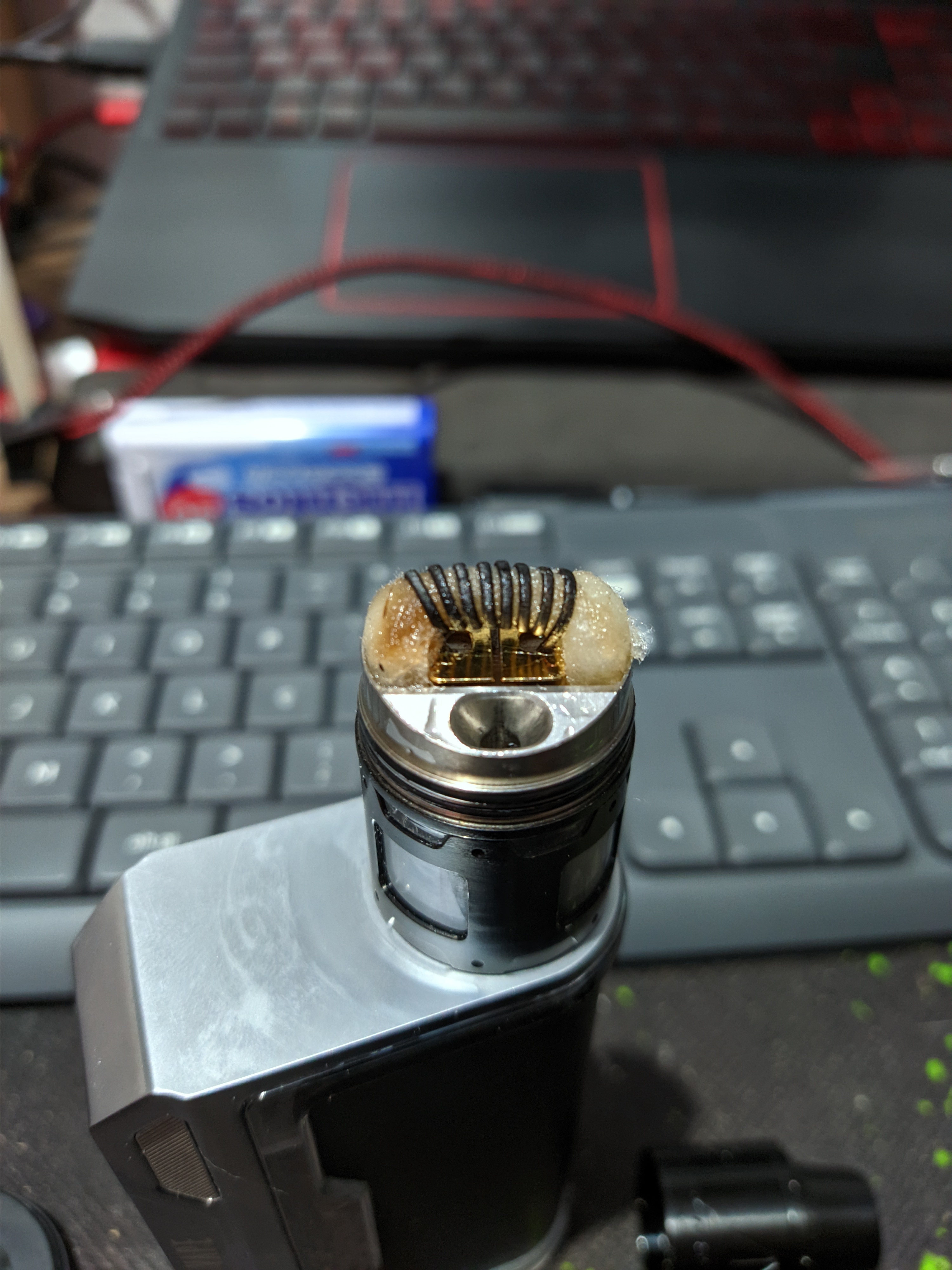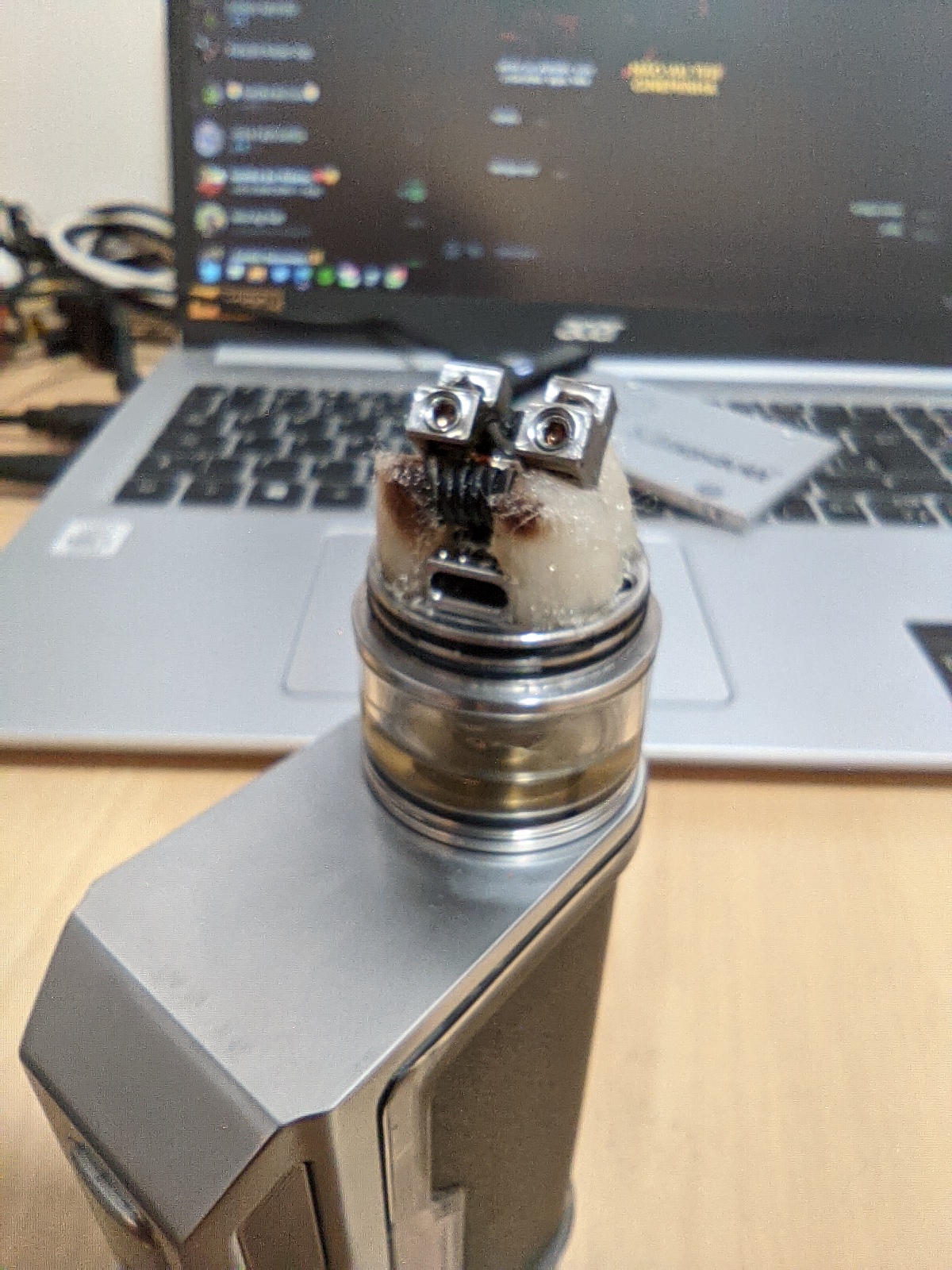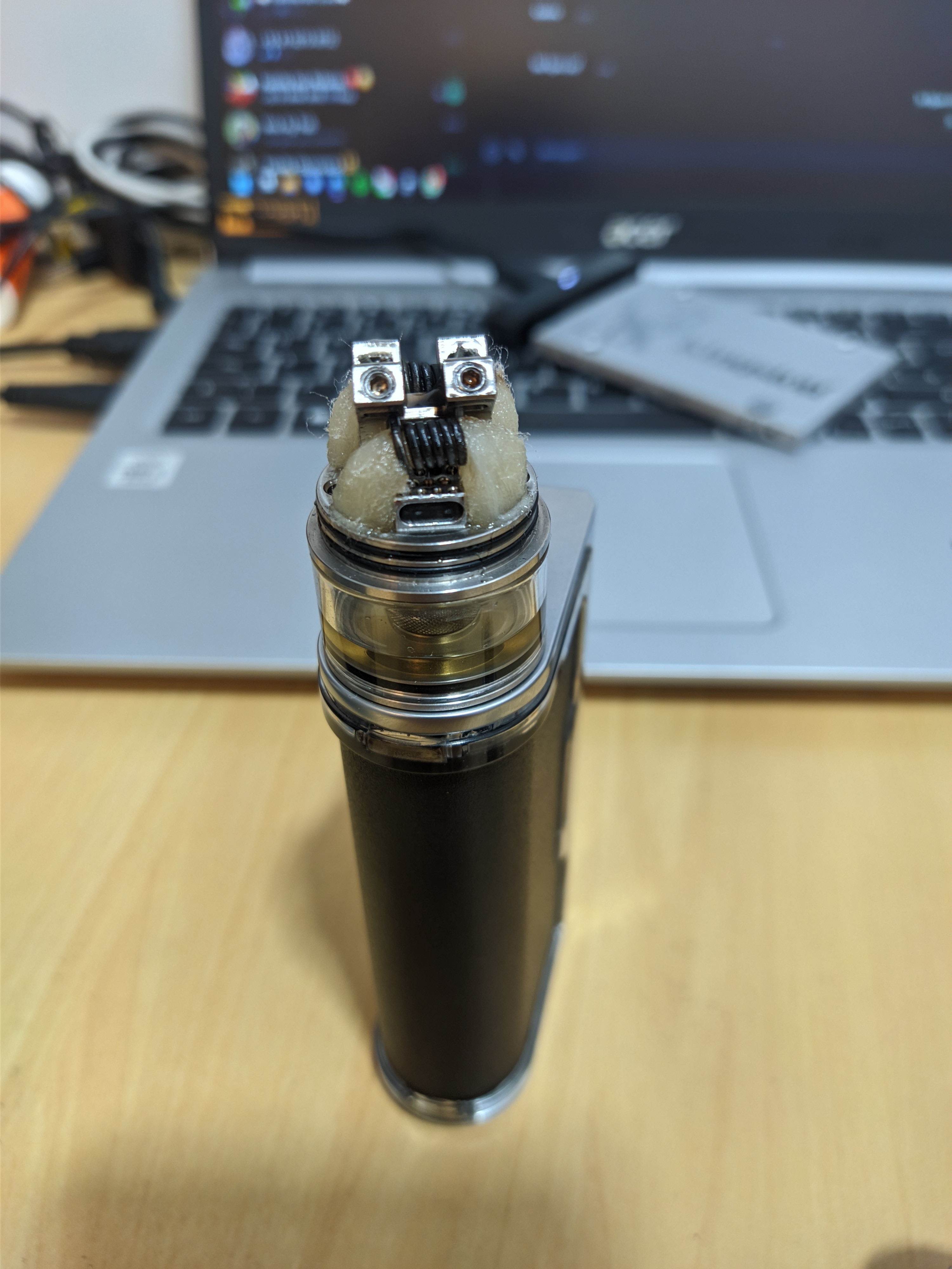 Am späten Vormittag zusätzlich: Ich habe es benutzt und mittags bemerkte ich, dass es mit der Menge an Baumwolle im Tank gut war, aber ich bemerkte auch, dass man nicht zu viel Baumwolle in der Nähe der Spule lassen kann, da es sehr nahe an den Innenwänden ist, was den Luftstrom verhindert, merkliche Verdunkelung der Baumwolle.